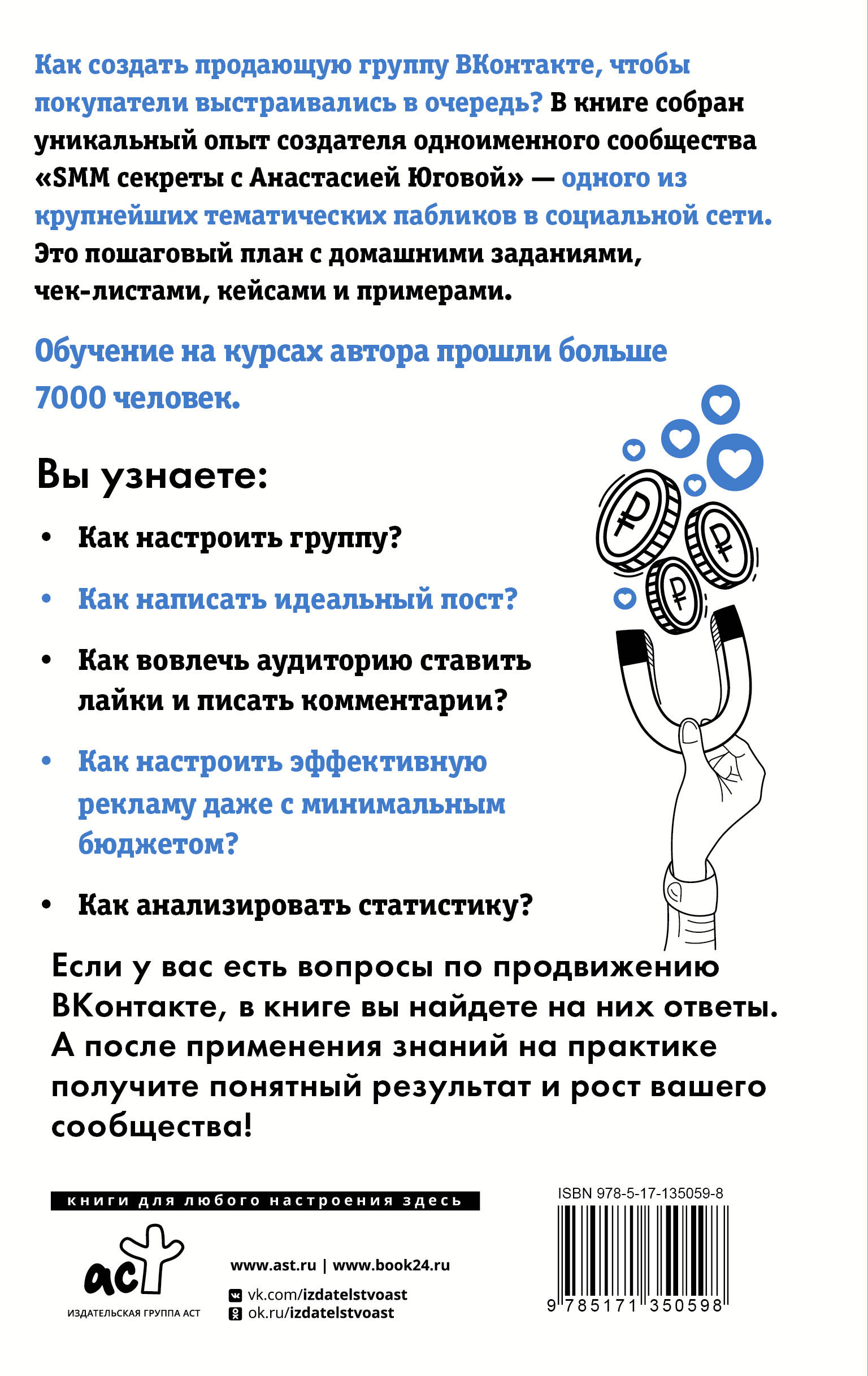Анастасия Югова - профессиональный маркетолог и создатель сообщества «SMM секреты с Анастасией Юговой» с аудиторией более 100 000 участников. Спикер в официальной академии ВКонтакте и конференций «Суровый Питерский SMM», IGconf, «Найди свой трафик», «Делай SMM». Автор лучшего сервиса на платформе VK Mini Apps.| Издательство | ИЗДАТЕЛЬСТВО "АСТ" |