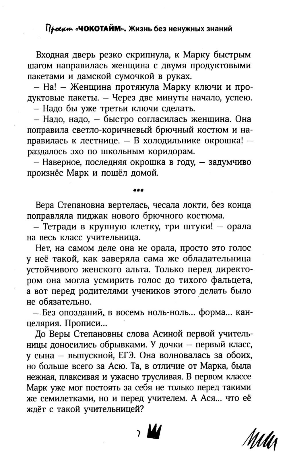 «Зачем мне это учить? Всё равно в жизни не пригодится!» - часто рассуждают школьники Среднегородска. Ведь и правда, тангенсы, деепричастия и законы Ома вспоминает не каждый взрослый. Так зачем это учить?! Мечта школьников сбывается: в городе открывается проект «Чокотайм» - место, где ребята вместо школы учатся реальным навыкам, которые пригодятся в жизни. Дети в восторге, родители в восхищении. Больше никакой школы, домашних заданий, дневников и прочих ненужностей. Но прежде чем стать участником проекта, каждый ребёнок должен стереть из памяти свои школьные знания. Так ли просто жить только с «нужными» знаниями? И кто придумал этот чудесный проект? Выпускник обычной школы Марк решает найти ответ на эти вопросы и понять, нужно ли образование современному человеку.| Издательство | Феникс |