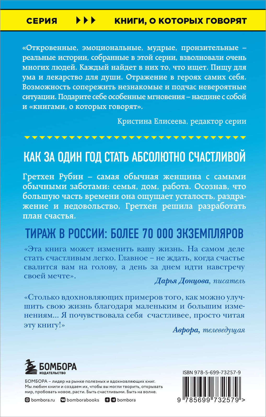 О КНИГЕ Мировой бестселлер. Переведено на 17 языков. Продано более 5 000 000 экземпляров. ОБ АВТОРЕ Любящий муж, замечательные дети, успешная карьера - у Гретхен Рубин были все основания считать себя счастливым человеком. Вместо этого она ощущала усталость, раздражение и недовольство. И тогда Рубин разработала план счастья. Ее книга о том, как благодаря небольшим изменениям в своей жизни можно достичь потрясающих результатов и стать счастливой. ОТЗЫВЫ О КНИГЕ «Эта книга может изменить вашу жизнь. На самом деле стать счастливым легко. Главное - не ждать, когда счастье свалится вам на голову, а день за днем идти навстречу своей мечте». - Дарья Донцова, писатель «Столько вдохновляющих примеров того, как можно улучшить свою жизнь благодаря маленьким и большим изменениям... Я почувствовала себя счастливее, просто читая эту книгу!» - Аврора, телеведущая «Благодаря этой замечательной книге вы научитесь легко совмещать работу, заботу о близких, и у вас еще останется время для себя». - Glamour