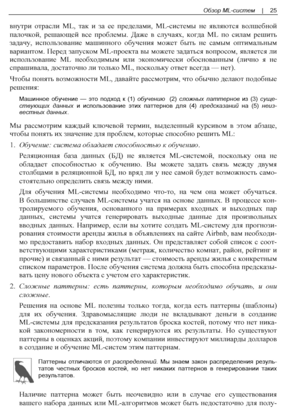 Сегодня машинное обучение - основной практический аппарат для применения искусственного интеллекта. Книга, основанная на стэнфордском учебном курсе, не ограничивается разбором конкретных библиотек, а описывает высокоуровневый подход к разработке систем машинного обучения, который упрощает их поддержку и развитие, позволяет избежать переобучения, искажения результатов. Рассказано, как сделать новую систему машинного обучения или нейронную сеть, надёжной, репрезентативной и расширяемой, а также качественно доработать уже существующие системы. Также показано, как подобрать библиотеки и алгоритмы с учётом имеющегося множества данных и действующих бизнес-требований, конструировать признаки и отслеживать метрики. Книга адресована программистам и специалистам по data science.| Издательство | Фолиант |