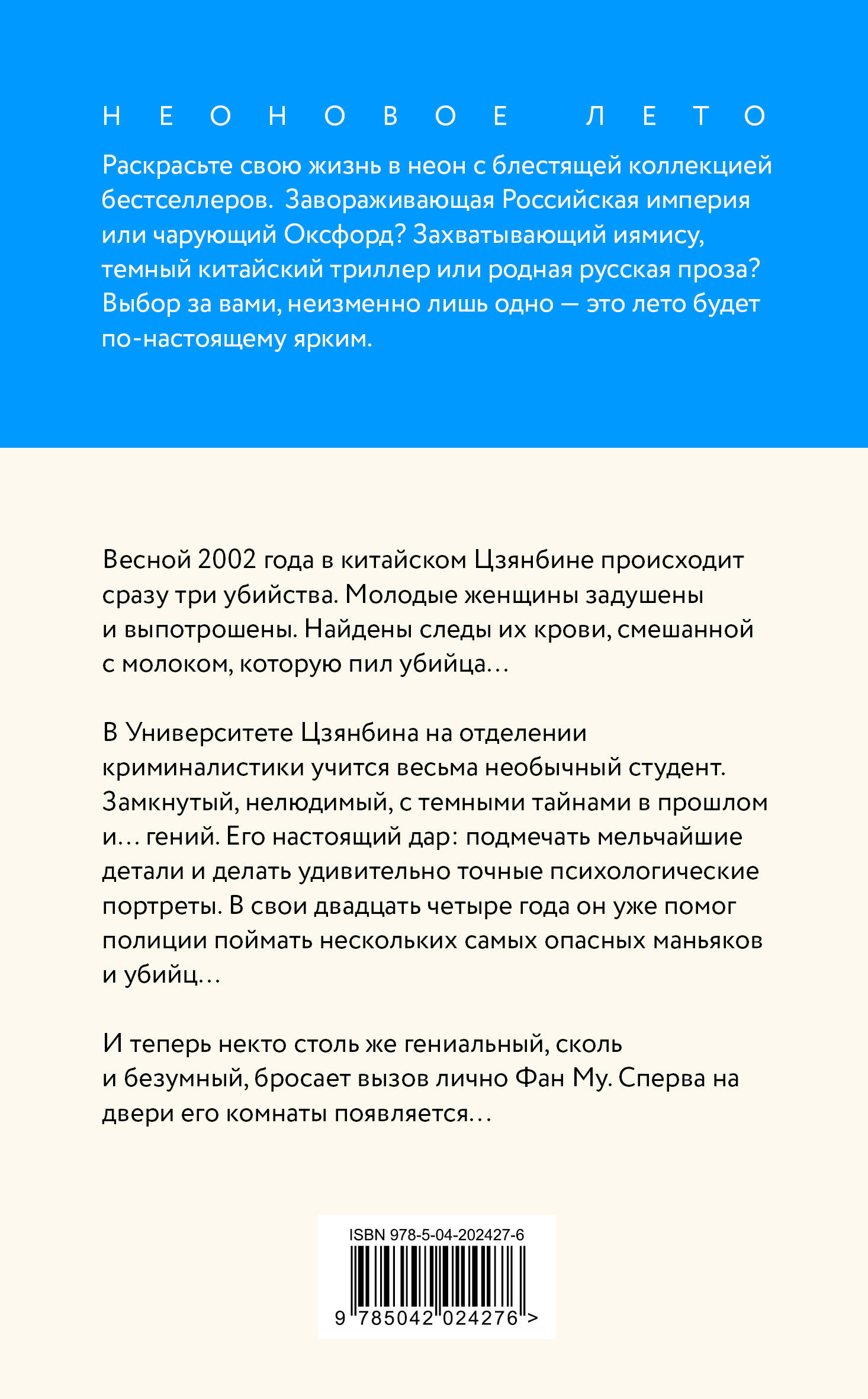 Национальный бестселлер Китая от преподавателя криминальной психологии в Университете уголовной полиции. Один из лучших образцов китайского иямису - популярного в Азии триллера, исследующего темную сторону человеческой натуры. Идеальное сочетание «Внутри убийцы», «Токийского зодиака» и «Молчания ягнят». «Вампир». Весной 2002 года в китайском Цзяньбине происходит сразу три убийства. Молодые женщины задушены и выпотрошены. Найдены следы их крови, смешанной с молоком, которую пил убийца… Фан Му. В Университете Цзянбина на отделении криминалистики учится весьма необычный студент. Замкнутый, нелюдимый, с темными тайнами в прошлом и… гений. Его настоящий дар: подмечать мельчайшие детали и делать удивительно точные психологические портреты. В свои двадцать четыре года он уже помог полиции поймать нескольких самых опасных маньяков и убийц… Смертельный экзамен. И теперь некто столь же гениальный, сколь и безумный, бросает вызов лично Фан Му. Сперва на двери его комнаты появляется пятиконечная звезда - фирменный знак знаменитого Ночного Сталкера. А на следующий день в Университете находят труп. Убийца в точности повторил способ, которым Ночной Сталкер расправлялся со своими жертвами. Не вписывается только шприц, найденный рядом с телом. Похоже, преступник предлагает профайлеру сыграть в игру: угадаешь следующего маньяка - предотвратишь новую смерть... Первый роман из серии книг о профайлере Фан Му. Особенности издания: блинтовое тиснение, лак, полусупер, запечатанные форзац и нахзац, качественная белая офсетная бумага блока текста.| Издательство | ООО "Издательство "Эксмо" |