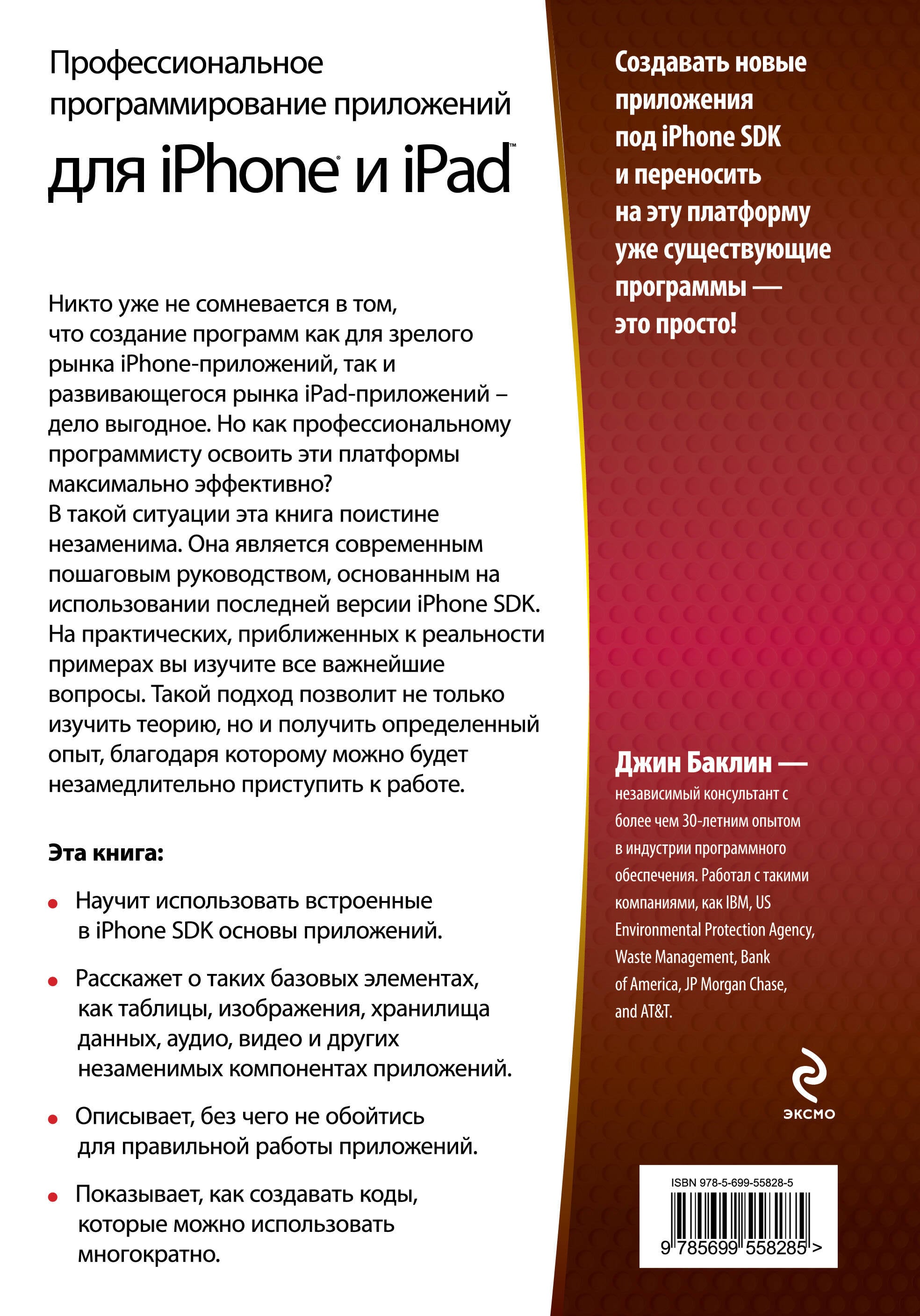 Создавать новые приложения под iPhone SDK и переносить на эту платформу уже существующие программы это просто! Никто уже не сомневается в том, что создание программ как для зрелого рынка iPhone-приложений, так и развивающегося рынка iPad-приложений дело выгодное. Но как профессиональному программисту освоить эти платформы максимально эффективно? Тут незаменима эта книга. Она является современным пошаговым руководством, основанным на использовании последней версии iPhone SDK. На практических, приближенных к реальности примерах вы изучите все важнейшие вопросы. Такой подход позволит не только изучить теорию, но и получить определенный опыт, благодаря которому можно будет незамедлительно приступить к работе. Все названия программных продуктов являются зарегистрированными торговыми марками соответствующих фирм. Никакая часть настоящего издания ни в каких целях не может быть воспроизведена в какой бы то ни было форме и какими бы то ни было средствами, будь то электронные или механические, включая фотокопирование и запись на магнитный носитель, если на это нет письменного разрешения ООО "Издательства "Эксмо".| Издательство | ООО "Издательство "Эксмо" |