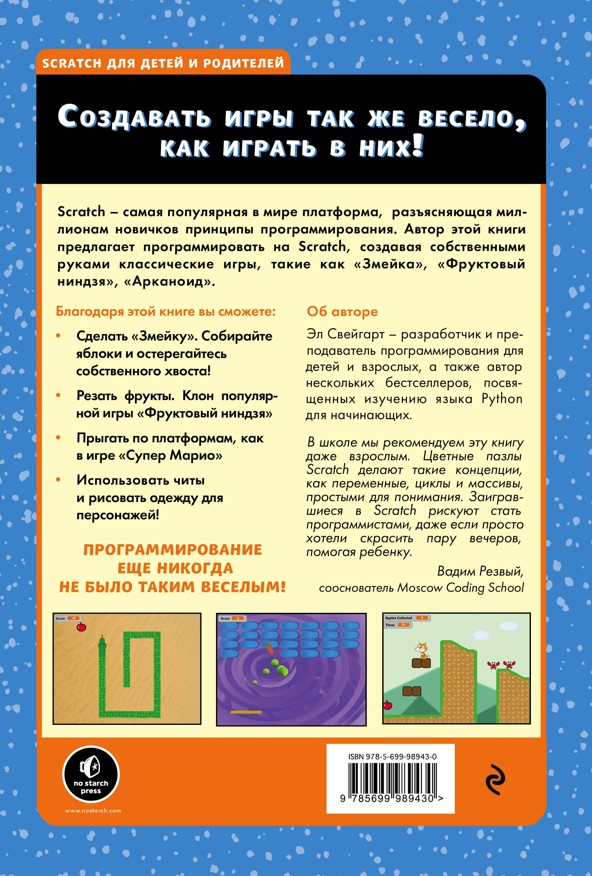 Цветной интересный и понятный самоучитель для детей по самому популярному в мире языку для начинающих программистов - Scratch. На примере создания веселых классических игр, таких как «Змейка» и «Фруктовый ниндзя», читатели не только осваивают Scratch, но и лучше понимают основные принципы программирования. Книга будет интересна и тем, кто никогда не программировал, и тем, кто хочет создавать собственные игры, но не знает как. Она подходит как для самостоятельного изучения Scratch, так и для совместных занятий с родителями или педагогом.| Издательство | ООО "Издательство "Эксмо" |