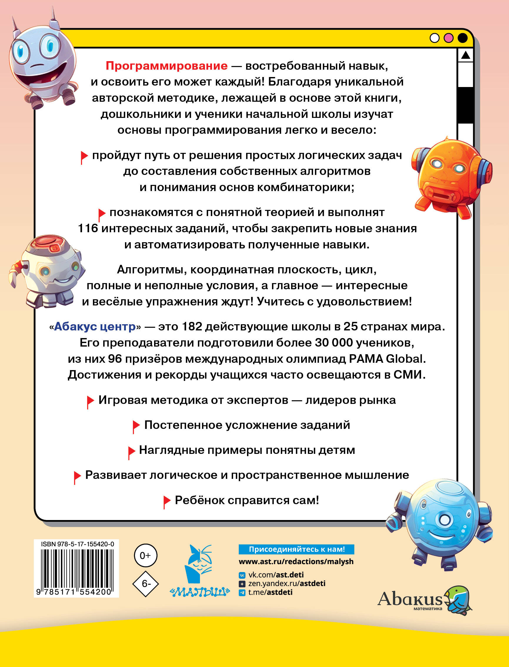 Может ли ребенок освоить программирование раньше, чем пойдет в школу? Легко! Перед вами эффективный практический тренажёр для детей от экспертов по ментальной арифметике. Его авторы, преподаватели Международной сети школ по развитию интеллекта и математического мышления «Абакус центр», создали комплекс методик с применением нейропсихологического подхода. В книге множество практических заданий и упражнений, с помощью которых родители смогут увлечь ребёнка математикой и помочь его интеллектуальному развитию. Программирование - востребованный навык, и освоить его может каждый! Благодаря уникальной авторской методике, лежащей в основе этой книги, дошкольники и ученики начальной школы изучат основы программирования легко и весело: • пройдут путь от решения простых логических задач до составления собственных алгоритмов и понимания основ комбинаторики; • познакомятся с понятной теорией и выполнят 116 интересных заданий, чтобы закрепить новые знания и автоматизировать полученные навыки. Алгоритмы, координатная плоскость, цикл, полные и неполные условия, а главное - интересные и весёлые упражнения ждут! Учитесь с удовольствием! «Абакус центр» - это 182 действующие школы в 25 странах мира. Его преподаватели подготовили более 30 000 учеников, из них 96 призеров международных олимпиад PAMA Global. Достижения и рекорды учащихся часто освещаются в СМИ. Фишки: • Игровая методика от экспертов - лидеров рынка • Постепенное усложнение заданий • Наглядные примеры понятны детям • Развивает логическое и пространственное мышление • Ребёнок справится сам!| Издательство | Издательство "АСТ" |