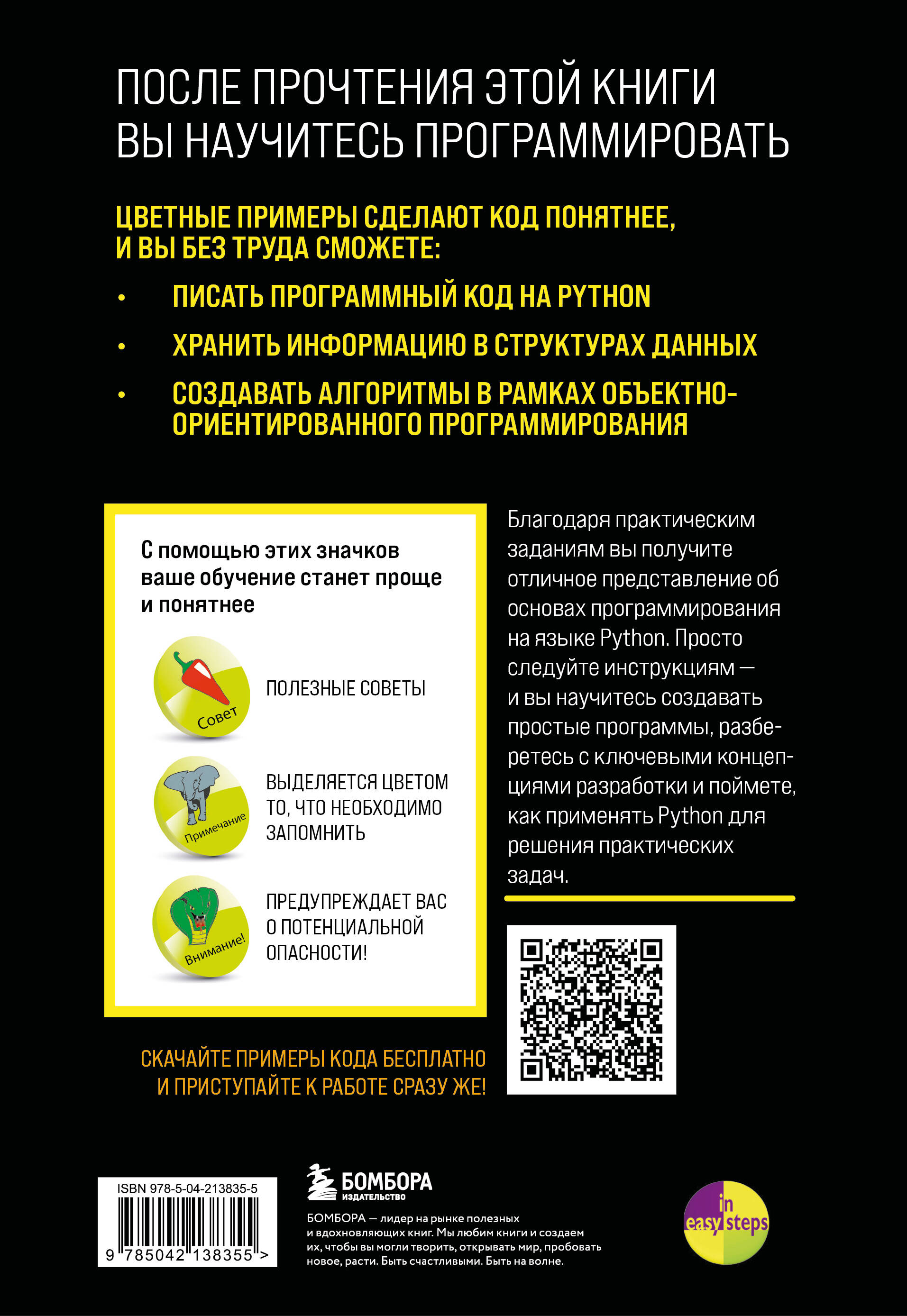 После прочтения этой книги вы научитесь программировать. Цветные примеры сделают код понятнее, и вы без труда сможете: · Писать программный код на Python. · Хранить информацию в структурах данных. · Создавать алгоритмы в рамках объектно-ориентированного программирования. Благодаря практическим заданиям вы получите отличное представление об основах программирования на языке Python. Просто следуйте инструкциям - и научитесь создавать простые программы, разберетесь с ключевыми концепциями разработки и поймете, как применять Python для решения практических задач. Скачайте примеры кода бесплатно и приступайте к работе сразу же!| Издательство | ООО "Издательство "Эксмо" |