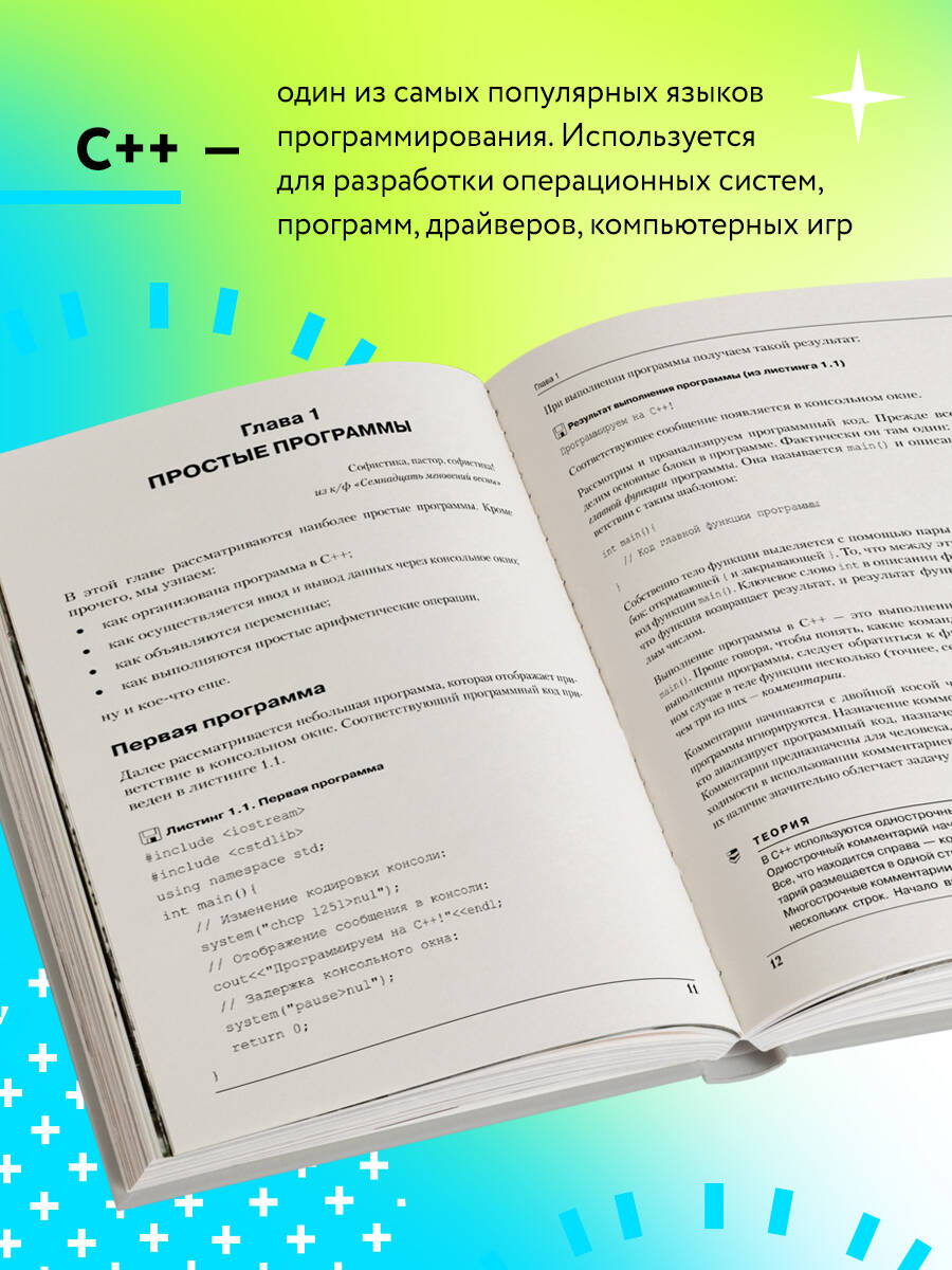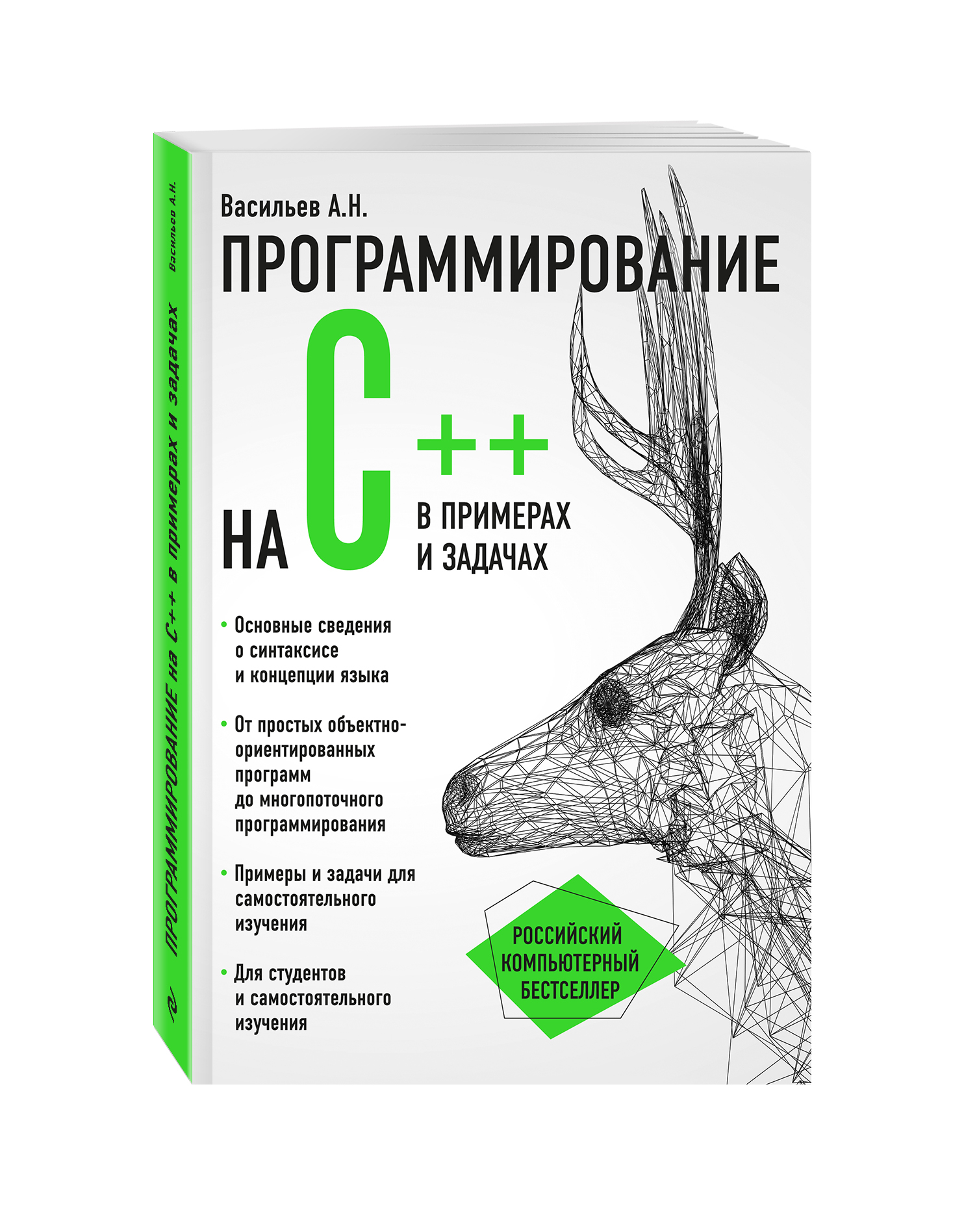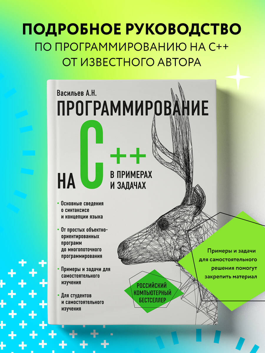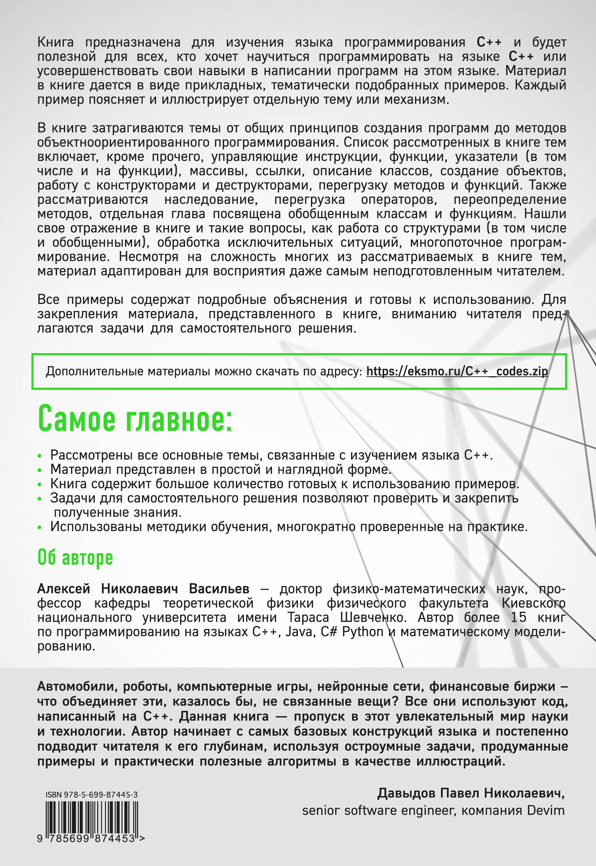 Книга предназначена для изучения языка программирования C++ и будет полезной для всех, кто хочет научиться программировать на языке C++ или усовершенствовать свои навыки в написании программ на этом языке. Материал в книге дается в виде прикладных, тематически подобранных примеров. Каждый пример поясняет и иллюстрирует отдельную тему или механизм. В книге затрагиваются темы от общих принципов создания программ до методов объектно-ориентированного программирования. Список рассмотренных в книге тем включает, кроме прочего, управляющие инструкции, функции, указатели (в том числе и на функции), массивы, ссылки, описание классов, создание объектов, работу с конструкторами и деструкторами, перегрузку методов и функций. Также рассматривается наследование, перегрузка операторов, переопределение методов, отдельная глава посвящена обобщенным классам и функциям. Нашли свое отражение в книге и такие вопросы, как работа со структурами (в том числе и обобщенными), обработка исключительных ситуаций, многопоточное программирование. Несмотря на сложность многих из рассматриваемых в книге тем, материал адаптирован для восприятия даже самым неподготовленным читателем. Все примеры содержат подробные объяснения и готовы к использованию. Для закрепления материала, представленного в книге, вниманию читателя предлагаются задачи для самостоятельного решения. Самое главное: ● Рассмотрены все основные темы, связанные с изучением языка C++. ● Материал представлен в простой и наглядной форме. ● Книга содержит большое количество готовых к использованию примеров. ● Задачи для самостоятельного решения позволяют проверить и закрепить полученные знания. ● Использованы методики обучения, многократно проверенные на практике. Об авторе Алексей Николаевич Васильев - доктор физико-математических наук, профессор кафедры теоретической физики физического факультета Киевского национального университета имени Тараса Шевченко. Автор более 15 книг по программированию на языках C++, Java, C# Python и математическому моделированию. «Автомобили, роботы, компьютерные игры, нейронные сети, финансовые биржи - что объединяет эти, казалось бы, не связанные вещи? Все они используют код, написанный на C++. Данная книга - ключ в этот увлекательный мир науки и технологии. Автор начинает с самых базовых конструкций языка и постепенно подводит читателя к его глубинам, используя остроумные задачи, продуманные примеры и практически полезные алгоритмы в качестве иллюстраций». - Давыдов Павел Николаевич, senior software engineer, компания Devim Слоганы Основные сведения о синтаксисе и концепции языка. От простых объектно-ориентированных программ до многопоточного программирования. Примеры и задачи для самостоятельного изучения. Для студентов и самостоятельного изучения.| Издательство | ООО "Издательство "Эксмо" |