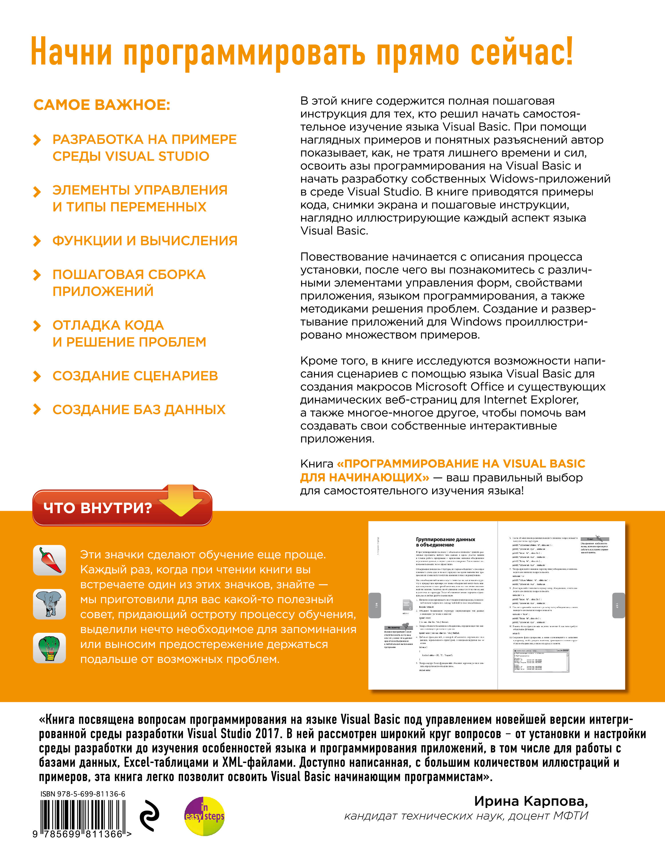В этой книге содержится полная пошаговая инструкция для тех, кто решил начать самостоятельное изучение языка Visual Basic. При помощи наглядных примеров и понятных разъяснений автор показывает, как, не тратя лишнего времени и сил, освоить азы программирования на Vusial Basic и начать разработку собственных Windows-приложений в среде Vusial Studio. В книге приводятся примеры кода, снимки экрана и пошаговые инструкции, наглядно иллюстрирующие каждый аспект языка Visual Basic. Повествование начинается с описания процесса установки, после чего вы познакомитесь с различными элементами управления форм, свойствами приложения, языком программирования, а также методиками решения проблем. Создание и развертывание приложений для Windows проиллюстрировано множеством примеров. Кроме того, в книге исследуются возможности написания сценариев с помощью языка Visual Basic для создания макросов Microsoft Office и существующих динамических веб-страниц для Internet Explorer, а также многое-многое другое, чтобы помочь вам создавать свои собственные интерактивные приложения. Книга "Программирование на Visual Basic для начиняющих - ваш правильный выбор для самостоятельного изучения языка! Самое важное: Указания легко применять Четкие пошаговые инструкции Последовательные иллюстрации Разработка на примере среды Visual Studio Подходит для самообучения Мировой бестселлер по изучению Visual Basic| Издательство | ООО "Издательство "Эксмо" |
