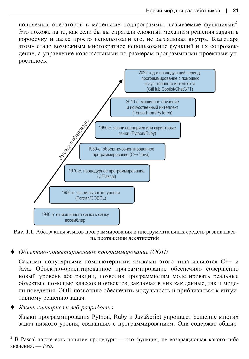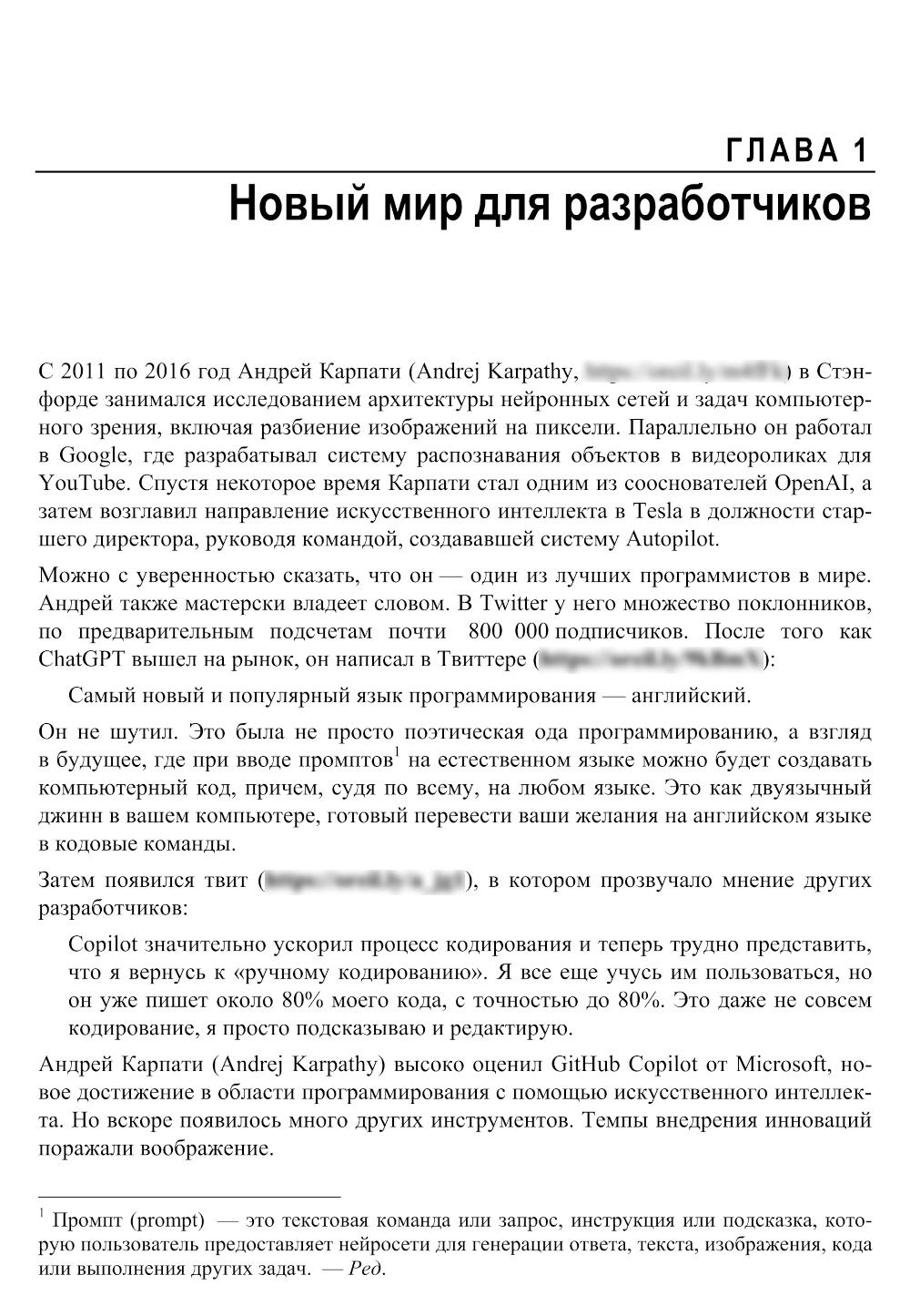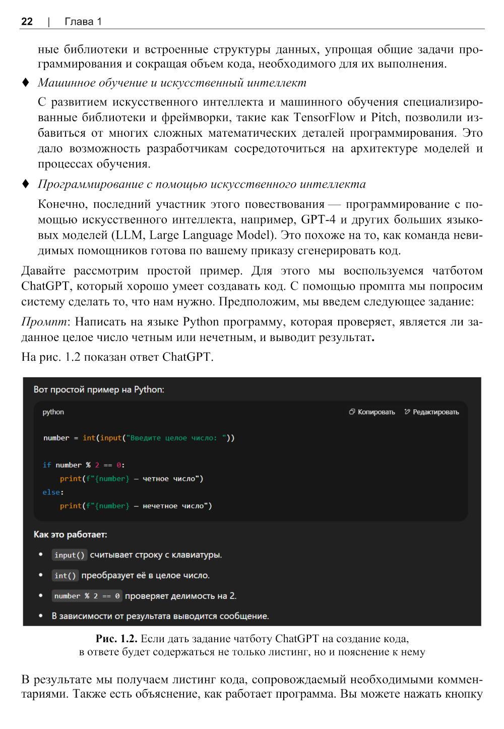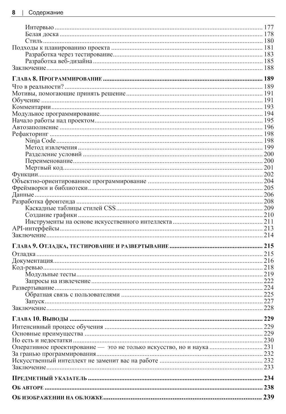 Книга посвящена практике использования инструментов искусственного интеллекта для всех этапов создания кода: от разработки требований и планирования до проектирования, написания, отладки и тестирования. Предложена методология модульного программирования, которая эффективно сочетается с подходом генерации кода с применением ИИ. Рассмотрены основные возможности и сценарии использования инструментов ИИ для разработки, оценены плюсы и минусы популярных систем. Показаны перспективы применения универсальных языковых моделей (LLM), таких как ChatGPT, Gemini, Claude и других, для решения задач программирования. Также рассмотрено применение широкого спектра специализированных систем (GitHub Copilot, Tabnine, Cursor, Amazon CodeWhisperer). Освещены вопросы инженерии промптов, автоматизации рутинных задач, таких как создание регулярных выражений, применения низкокодового и бескодового программирования и др. Для широкого круга разработчиков.| Издательство | АЛИСТ |