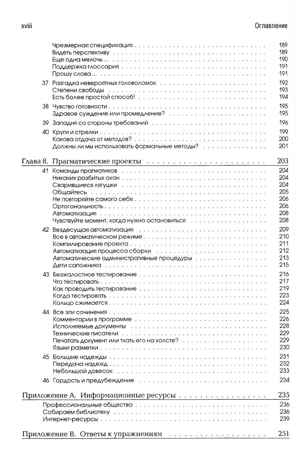 Книга «программист-прагматик» написана в виде последовательных законченных разделов и изобилует анекдотами, серьезными примерами и разнообразными аналогиями. В ней описываются самые интересные случаи из практики авторов и основные ловушки, относящиеся к разным аспектам разработки программ. Будь вы новичок, опытный программист или менеджер, ответственный за проекты в области программного обеспечения, - в любом случае используйте в своей работе уроки, описанные в книге, и вскоре ваша производительность, точность и удовлетворение от сделанной работы возрастут. Вы получите навыки и сформируете привычки, которые станут основой для долгосрочной успешной карьеры. Вы станете программистом-прагматиком. Энди Хант - энергичный столяр и музыкант, но (что интересно) пользуется наибольшим спросом как консультант. Энди специализируется в сочетании проверенных методик с новейшими технологиями, создавая непривычные, но от того не менее практичные конструкции. Энди - владелец своей собственной консалтинговой фирмы в Роли (штат Северная Каролина). Дейв Томас любит совершать полеты на одномоторных самолетах и оплачивает свою привычку, отыскивая элегантные решения трудных задач, работая консультантом в таких разных областях, как аэрокосмическая промышленность, банковские и финансовые услуги, связь, туризм и транспорт, а также Интернет. До своего переезда в США (1994) Дейв стал основателем британской компьютерной фирмы, прошедшей сертификацию по ISO9001, которая осуществляла разработку сложных проектов для конкретных заказчиков по всему миру. В настоящее время Дейв является независимым консультантом в Далласе (штат Техас). В настоящее время Дейв и Энди работают под именем The Pragmatic Programmers, L.L.C., предоставляя свои услуги клиентам в США и используя совместный опыт работы, насчитывающий свыше 40 лет.| Издательство | Лори |