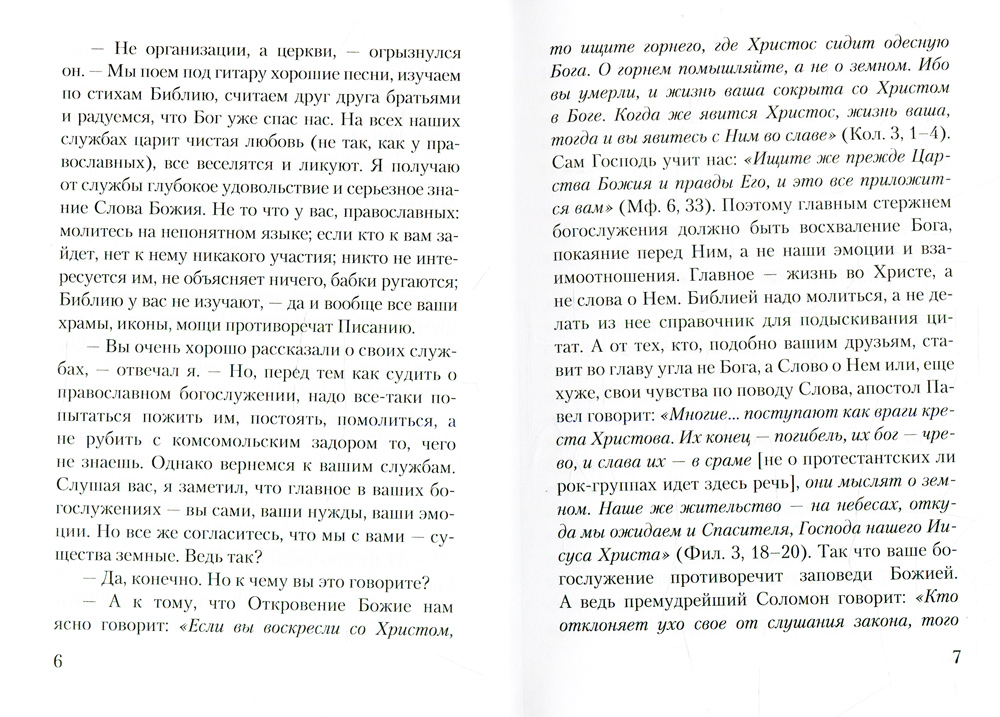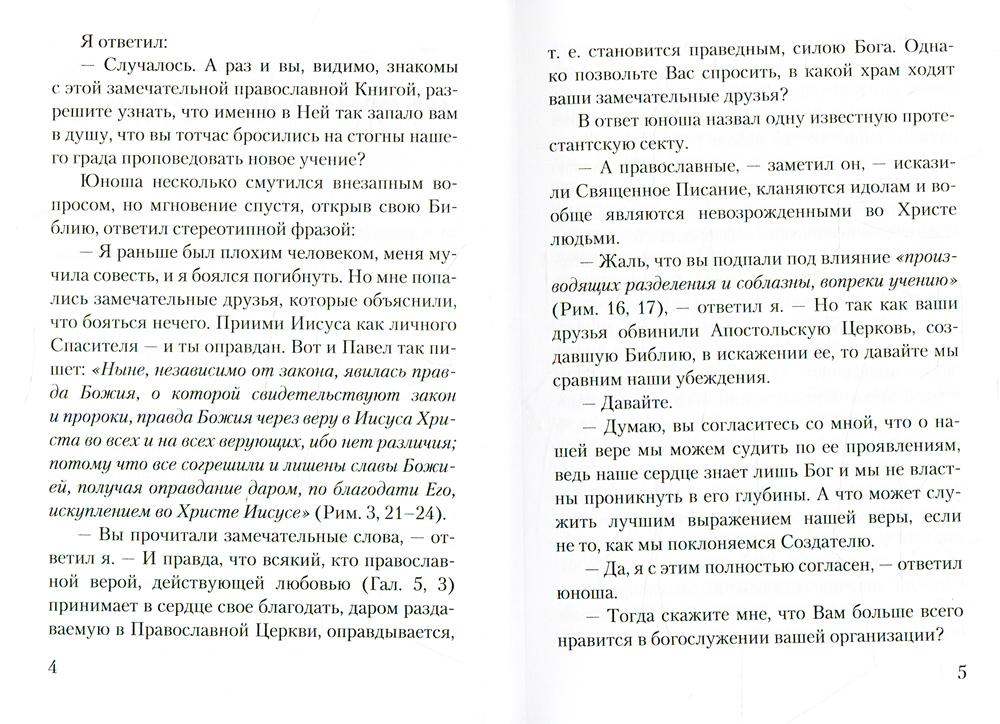 Истина не терпит заблуждений и сама находит ищущих ее. Но для этого есть условие: необходимо отказаться от своего мнения в пользу Господа и искать не себя, а Бога. Трудно уйти от того, чем ты жил и в чем был уверен, полагая, что стоишь на правильном пути. Но тех, кто готов так поступить, Бог называет избранными. Эта книга - невымышленный диалог с молодым протестантом, который сам подошел к православному прохожему в районе Таганки весенним утром. Искал ли он истину, что ответил и как вел себя православный, изменилось ли что-то в их сердцах после диалога, и кто оказался прав? Читатель станет свидетелем этого разговора и услышит множество аргументов, основанных на Священном Писании.| Издательство | Благ.фонд "Мисс. центр им.иерея Даниила Сысоева" |