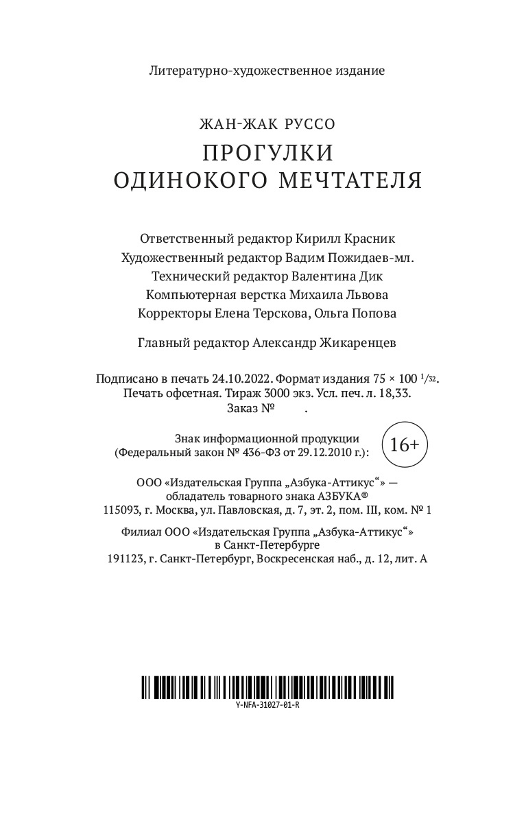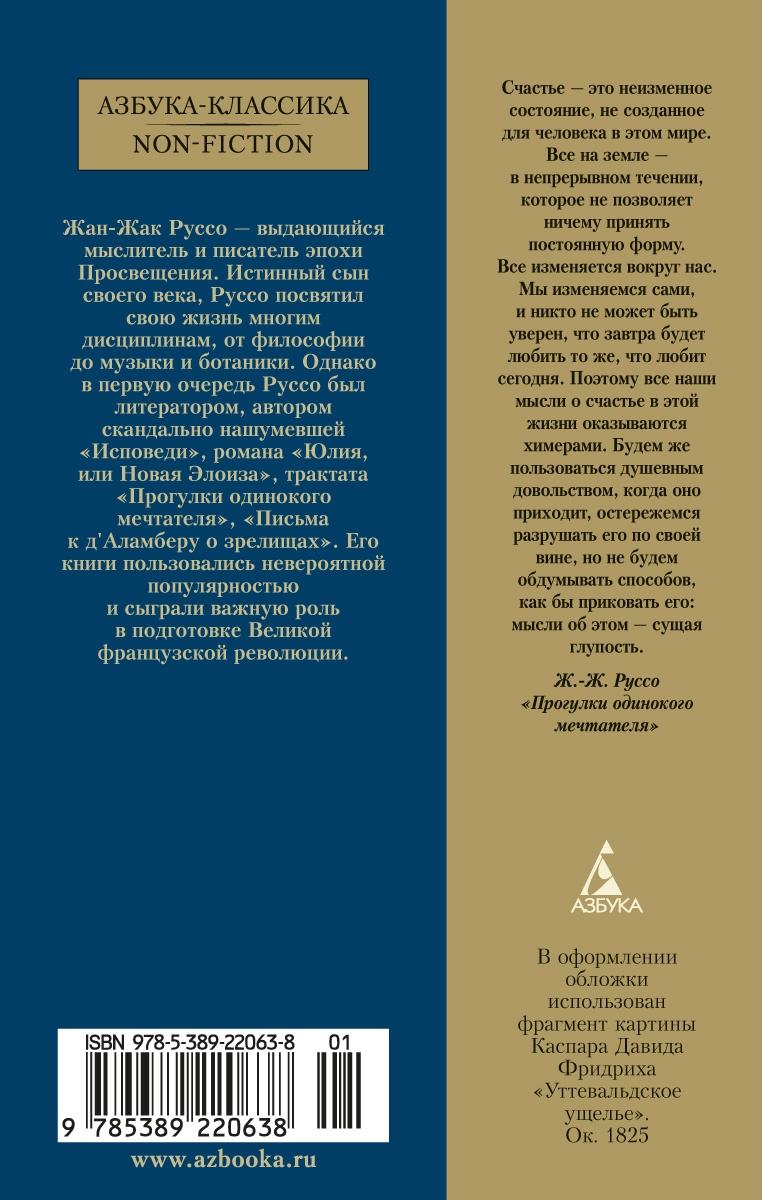 Жан-Жак Руссо - выдающийся мыслитель и писатель эпохи Просвещения. Истинный сын своего века, Руссо посвятил свою жизнь многим дисциплинам, от философии до музыки и ботаники. Однако в первую очередь Руссо был литератором, автором скандально нашумевшей «Исповеди», романа «Юлия, или Новая Элоиза», трактата «Прогулки одинокого мечтателя», «Письма к д'Аламберу». Его книги пользовались невероятной популярностью и сыграли важную роль в подготовке Великой французской революции. В настоящее издание вошли три работы Жан-Жака Руссо: «Прогулки одинокого мечтателя» - последний труд автора, в некотором смысле подводящий черту под всей его жизнью и творчеством; «Рассуждение о науках и искусствах» - первое зрелое произведение Руссо, в котором уже заложена основа всех его будущих идей и мыслей; а также знаменитое «Письмо к д'Аламберу о зрелищах», в котором Руссо подвергает критике современное ему искусство, далекое от жизни и интересов простого зрителя.| Издательство | Азбука |