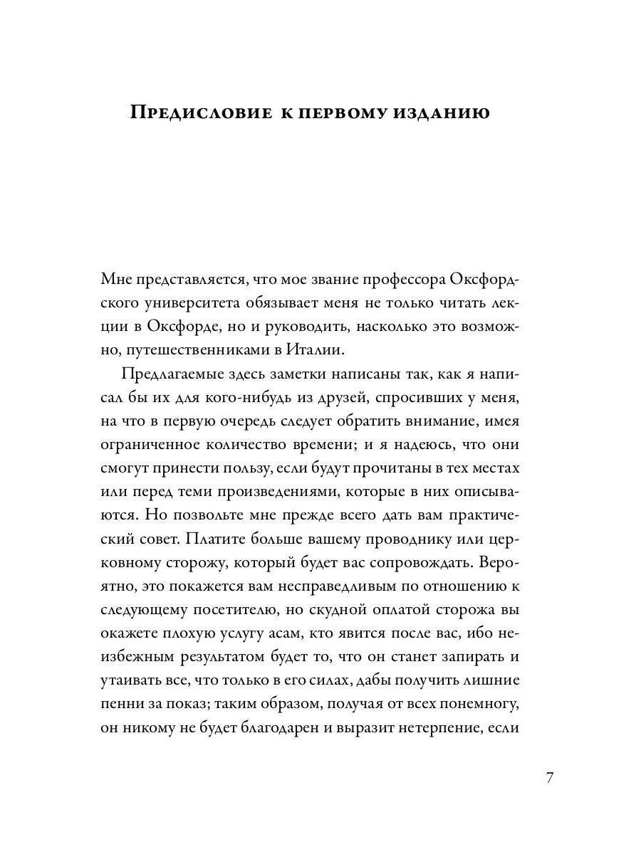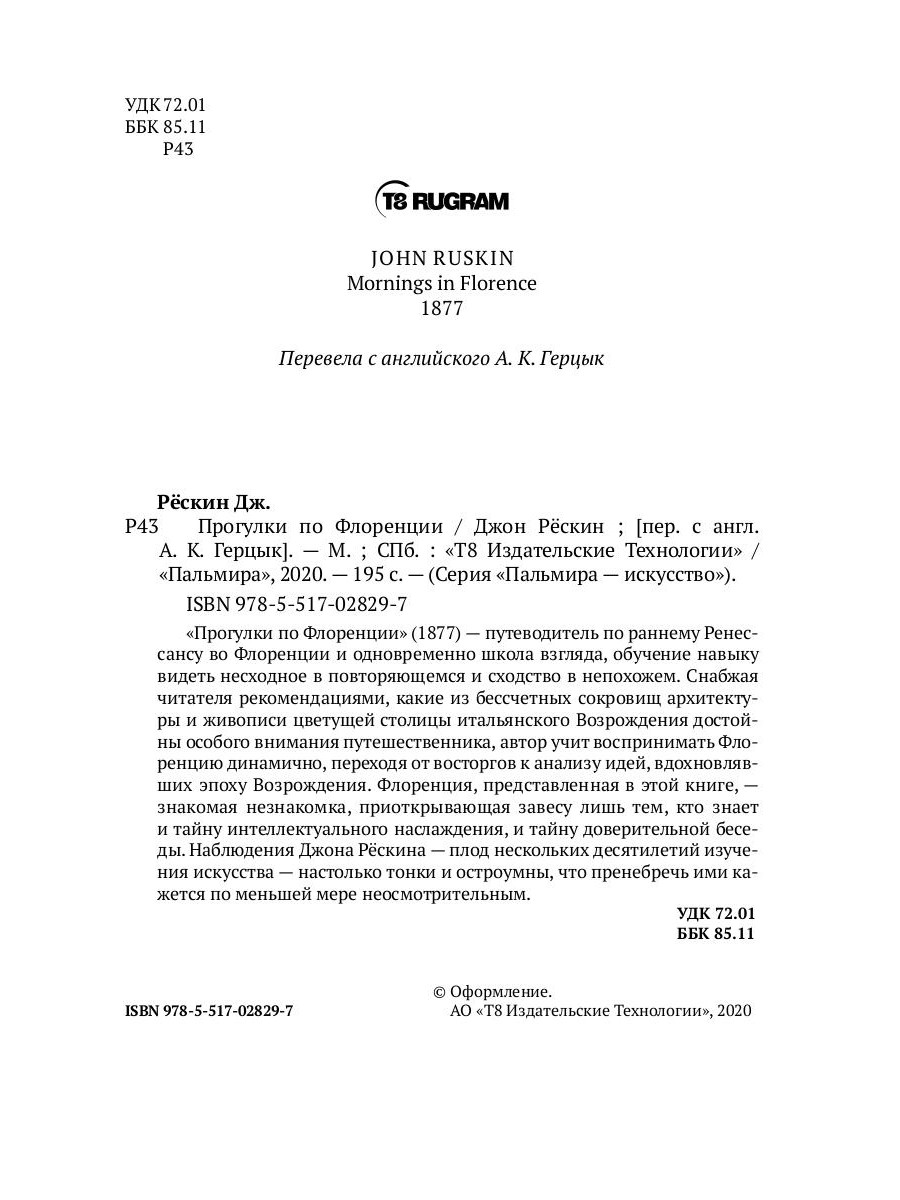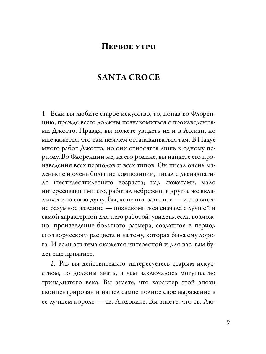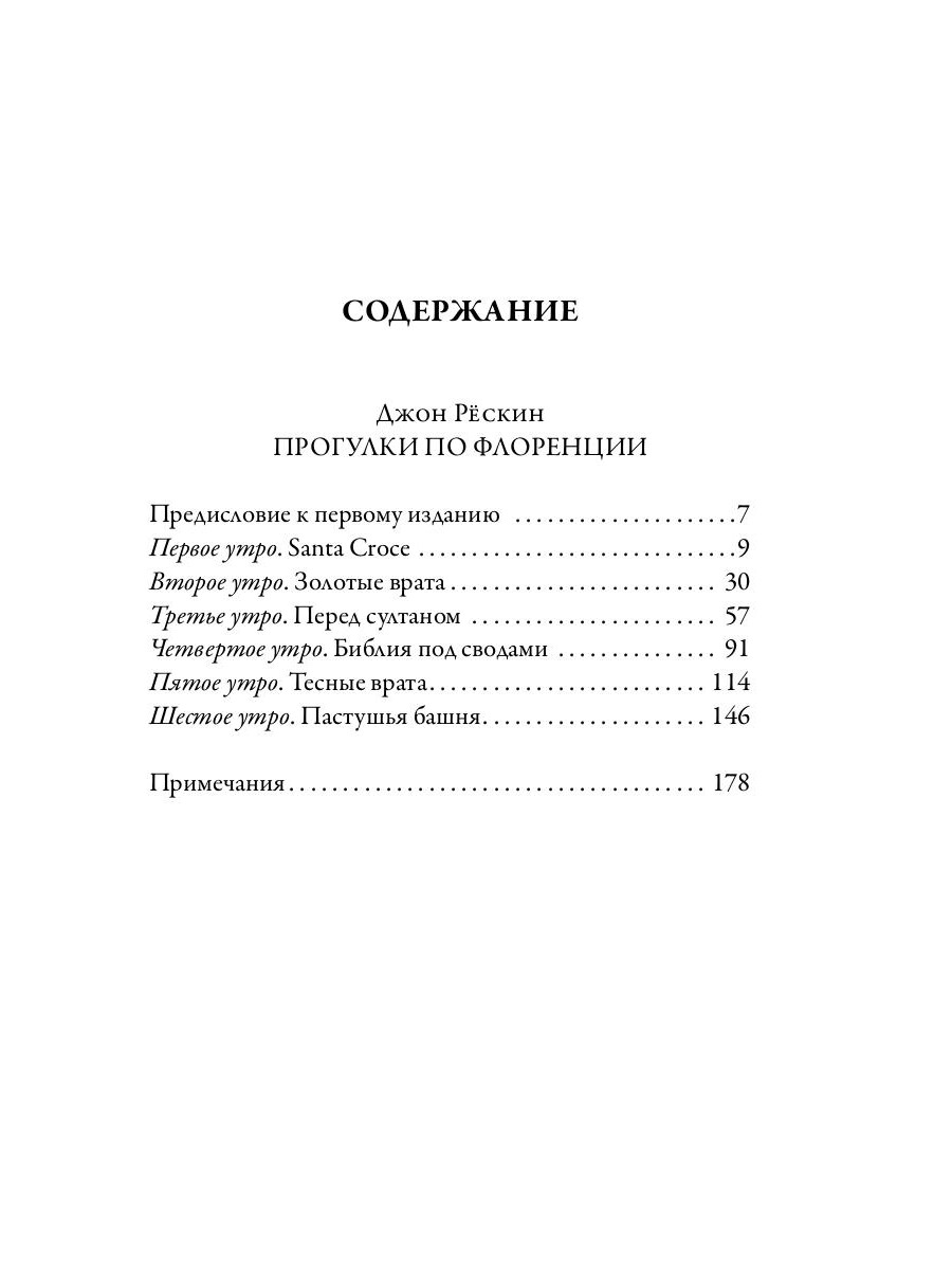 «Прогулки по Флоренции» (1877) - путеводитель по раннему Ренессансу во Флоренции и одновременно школа взгляда, обучение навыку видеть несходное в повторяющемся и сходство в непохожем. Снабжая читателя рекомендациями, какие из бессчетных сокровищ архитектуры и живописи цветущей столицы итальянского Возрождения достойны особого внимания путешественника, автор учит воспринимать Флоренцию динамично, переходя от восторгов к анализу идей, вдохновлявших эпоху Возрождения. Флоренция, представленная в этой книге, - знакомая незнакомка, приоткрывающая завесу лишь тем, кто знает и тайну интеллектуального наслаждения, и тайну доверительной беседы. Наблюдения Джона Рёскина - плод нескольких десятилетий изучения искусства - настолько тонки и остроумны, что пренебречь ими кажется по меньшей мере неосмотрительным.