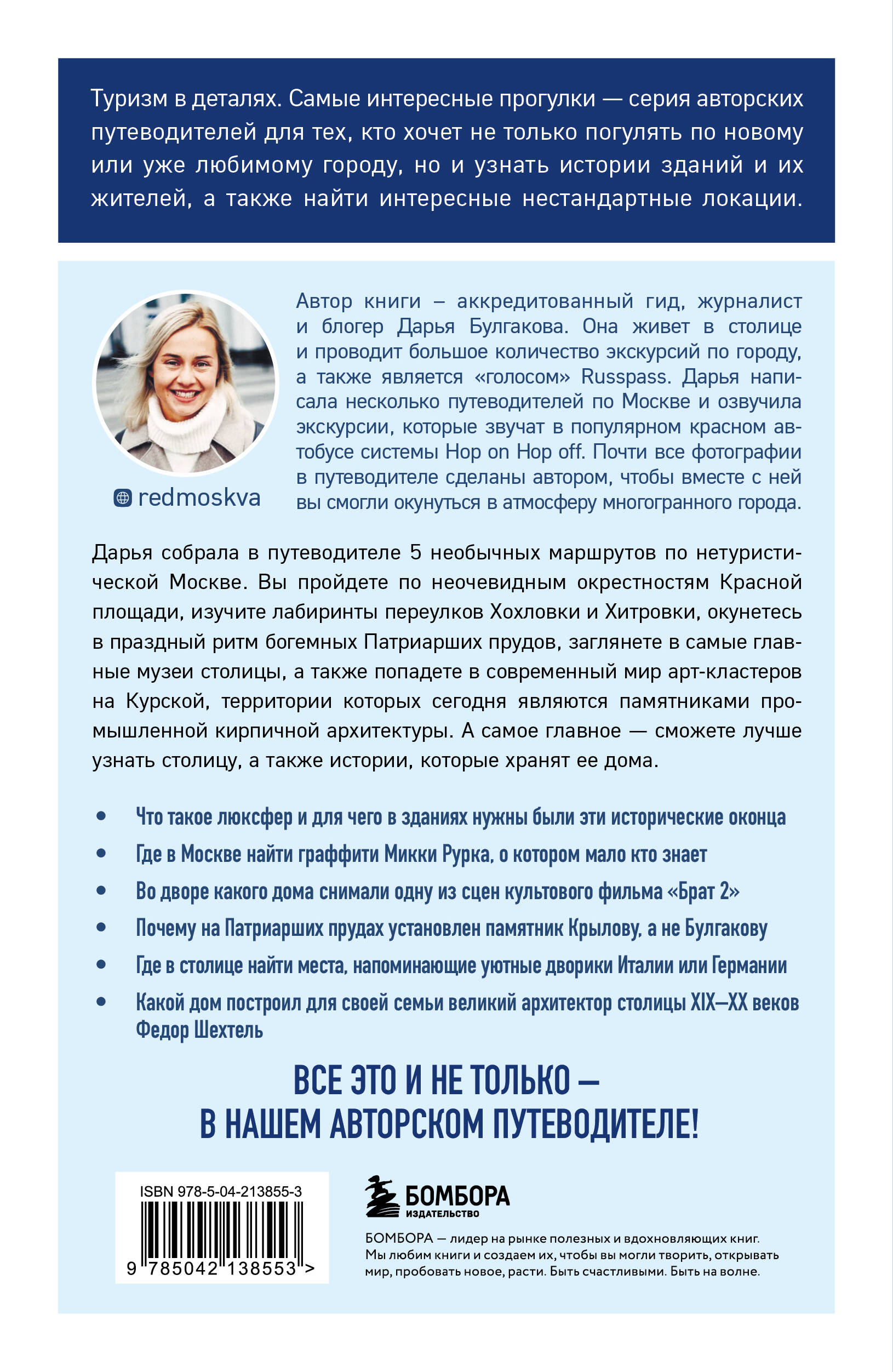 Уже 3-е издание авторского путеводителя известного московского гида Дарьи Булгаковой! С его помощью вы откроете Москву с новой стороны, узнаете столицу чуть лучше, а также истории, которые хранят ее дома. Книга будет интересна как гостям города, так и москвичам, которые хотят узнать больше о своем родном крае. Внутри Дарья собрала 5 небанальных маршрутов, благодаря которым вы прогуляетесь по самым знаковым районам и неочевидным достопримечательностям. Вы пройдете по окрестностям Красной площади, изучите лабиринты переулков Хохловки и Хитровки, окунетесь в праздный ритм богемных Патриарших прудов, заглянете в самые главные музеи столицы, а также попадете в современный мир арт-кластеров на Курской. Следуя по этим маршрутам, вы сможете узнать: • Почему на Патриарших прудах установлен памятник Крылову, а не Булгакову. • Где в столице найти места, напоминающие уютные дворики Италии или Германии. • Во дворе какого дома снимали сцену из культового фильма «Брат-2». Все это и многое другое - на страницах нашего нового авторского путеводителя!| Издательство | ООО "Издательство "Эксмо" |