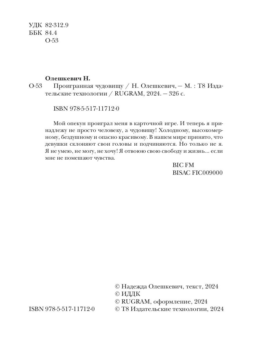 Мой опекун проиграл меня в карточной игре. И теперь я принадлежу не просто человеку, а чудовищу! Холодному, высокомерному, бездушному и опасно красивому. В нашем мире принято, что девушки склоняют свои головы и подчиняются. Но только не я. Я не умею, не могу, не хочу! Я отвоюю свою свободу и жизнь… если мне не помешают чувства.| Издательство | Т8 RUGRAM |