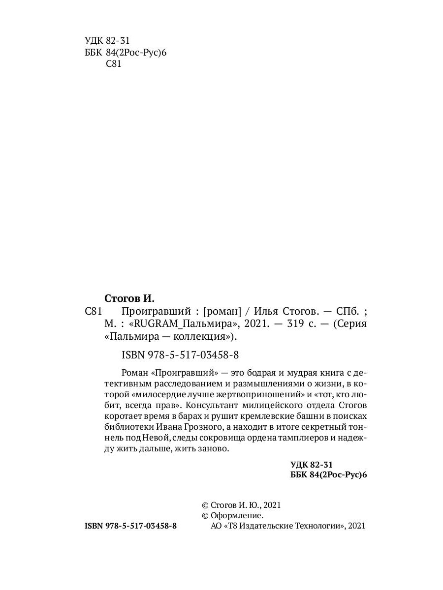 Роман «Проигравший» - это бодрая и мудрая книга с детективным расследованием и размышлениями о жизни, в которой «милосердие лучше жертвоприношений» и «тот, кто любит, всегда прав». Консультант милицейского отдела Стогов коротает время в барах и рушит кремлевские башни в поисках библиотеки Ивана Грозного, а находит в итоге секретный тоннель под Невой, следы сокровища ордена тамплиеров и надежду жить дальше, жить заново.| Издательство | Т8 RUGRAM |