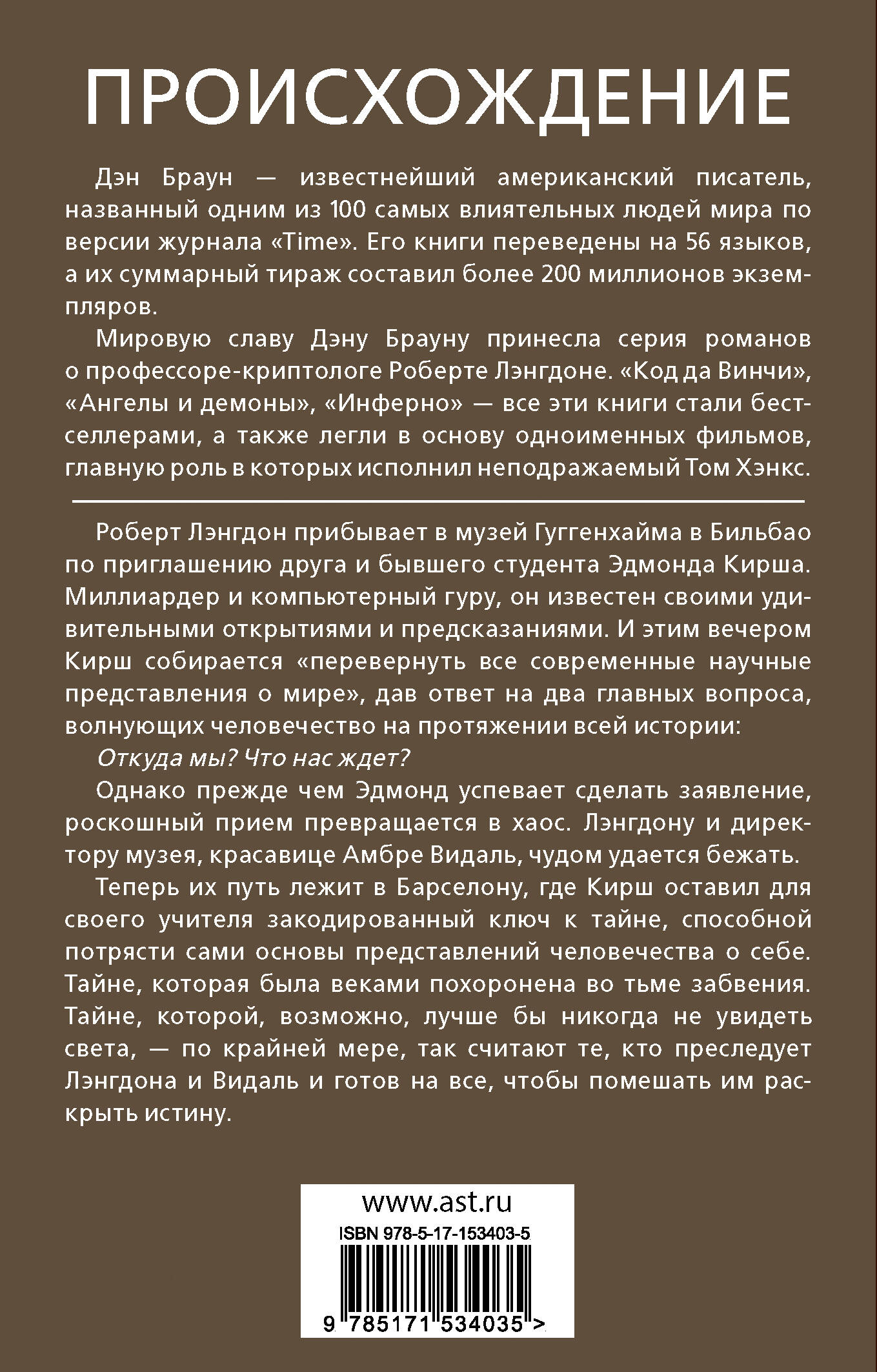 Пятая книга о расследовании профессора Роберта Лэнгдона от автора бестселлера «Код Да Винчи» - Дэна Брауна. Четыре из пяти романов цикла уже экранизированы! Читайте книги и смотрите кино!| Издательство | ИЗДАТЕЛЬСТВО "АСТ" |
