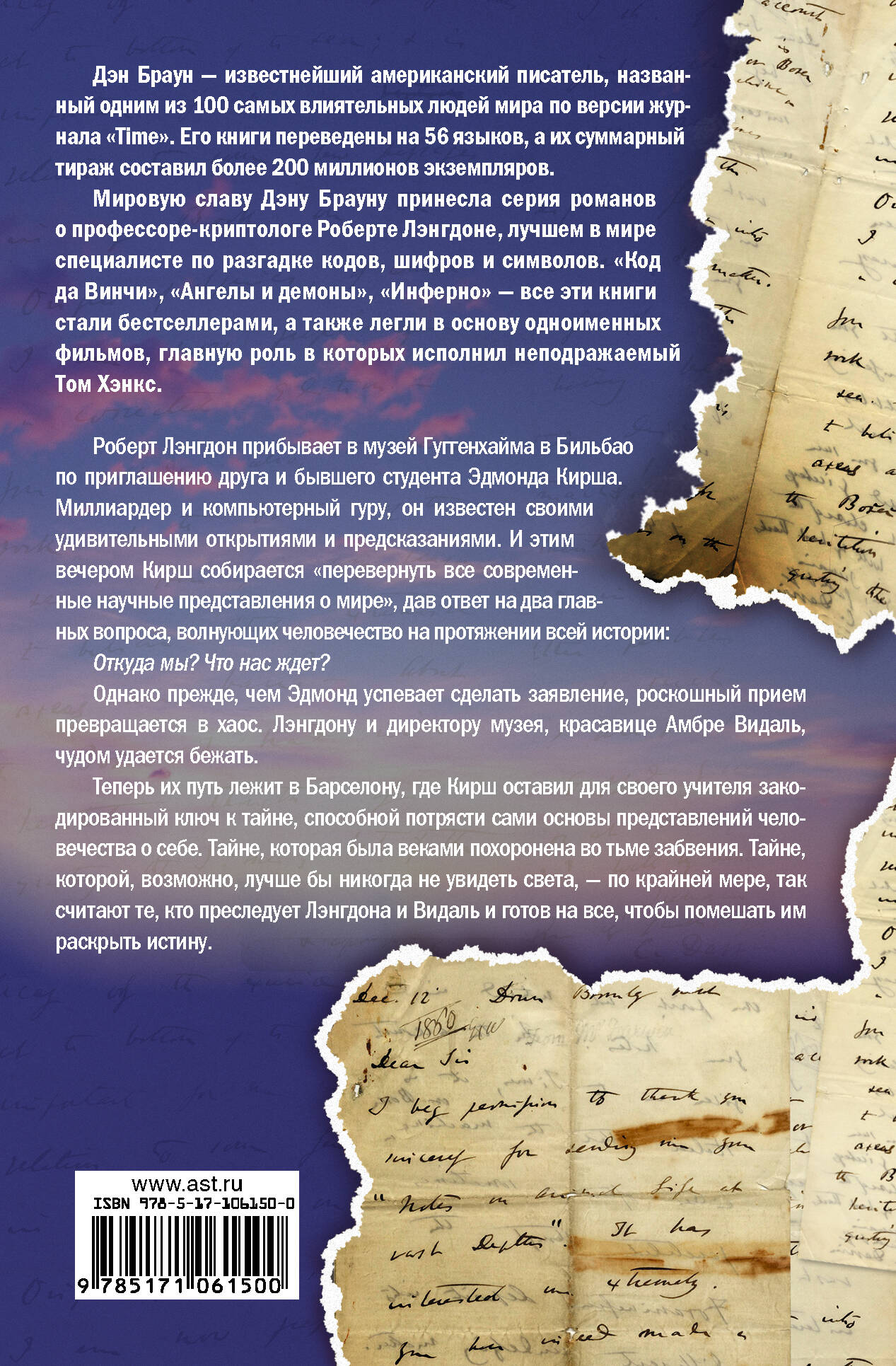 Роберт Лэнгдон прибывает в музей Гуггенхайма в Бильбао по приглашению друга и бывшего студента Эдмонда Кирша. Миллиардер и компьютерный гуру, он известен своими удивительными открытиями и предсказаниями. И этим вечером Кирш собирается "перевернуть все современные научные представления о мире", дав ответ на два главных вопроса, волнующих человечество на протяжении всей истории: Откуда мы? Что нас ждет? Однако прежде чем Эдмонд успевает сделать заявление, роскошный прием превращается в хаос. Лэнгдону и директору музея, красавице Амбре Видаль, чудом удается бежать. Теперь их путь лежит в Барселону, где Кирш оставил для своего учителя закодированный ключ к тайне, способной потрясти сами основы представлений человечества о себе. Тайне, которая была веками похоронена во тьме забвения. Тайне, которой, возможно, лучше бы никогда не увидеть света, - по крайней мере, так считают те, кто преследует Лэнгдона и Видаль и готов на все, чтобы помешать им раскрыть истину.| Издательство | ИЗДАТЕЛЬСТВО "АСТ" |