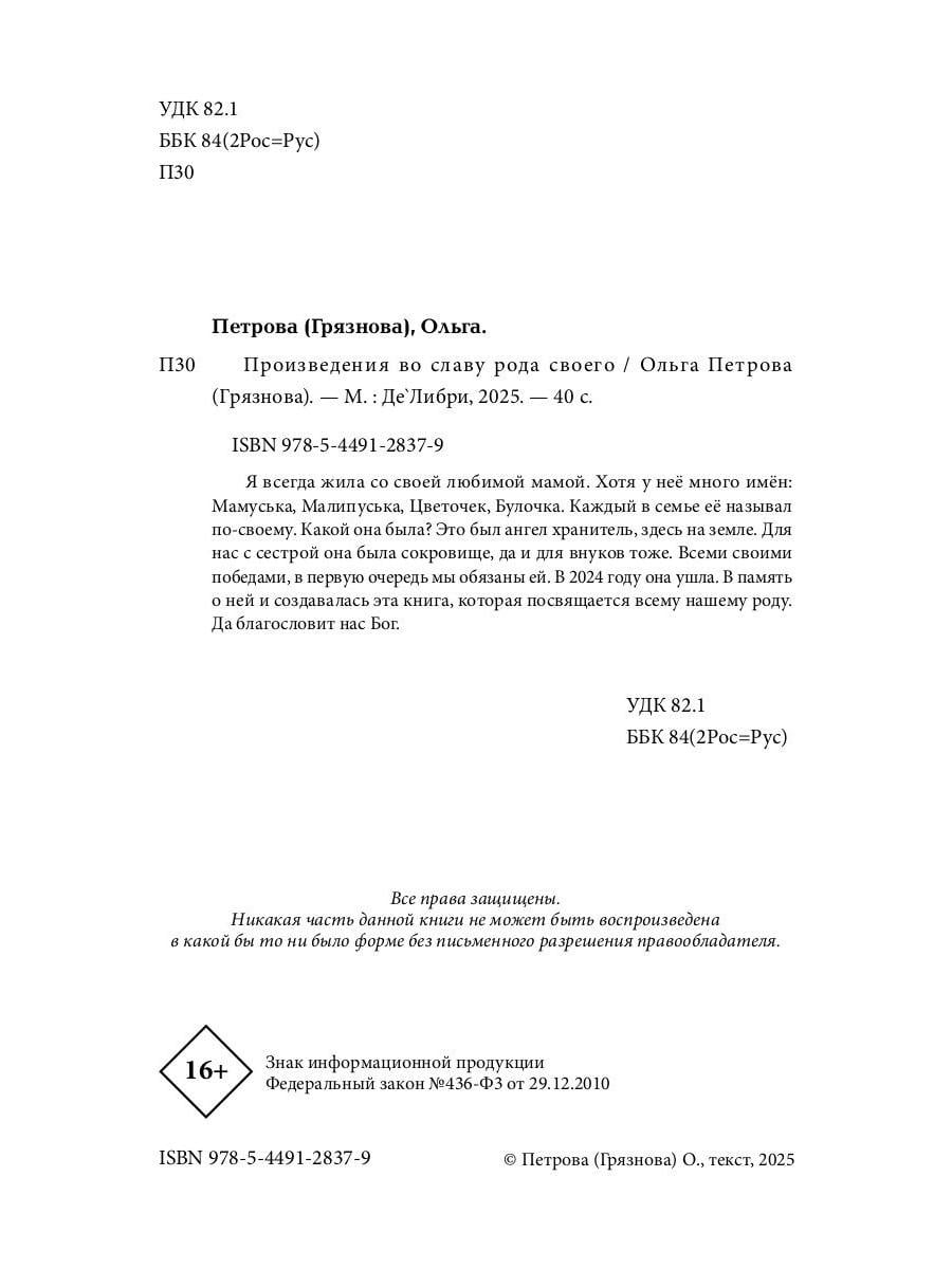 Я всегда жила со своей любимой мамой. Хотя у неё много имён: Мамуська, Малипуська, Цветочек, Булочка. Каждый в семье её называл по-своему. Какой она была? Это был ангел хранитель, здесь на земле. Для нас с сестрой она была сокровище, да и для внуков тоже. Всеми своими победами, в первую очередь мы обязаны ей. В 2024 году она ушла. В память о ней и создавалась эта книга, которая освящается всему нашему роду. Да благословит нас Бог.| Издательство | Рипол Классик |