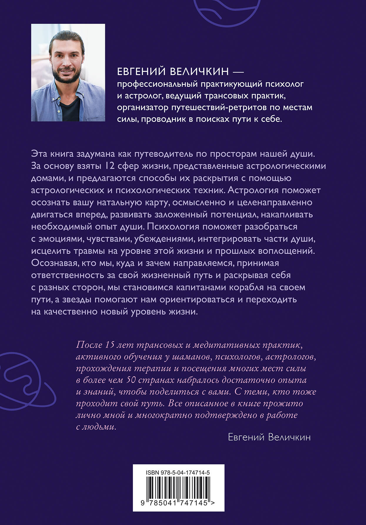 Евгений Величкин - профессиональный практикующий психолог и астролог, ведущий трансовых практик, организатор путешествий-ретритов по местам силы, проводник в поисках пути к себе. Эта книга задумана как путеводитель по просторам нашей души. За основу взяты 12 сфер жизни, представленные астрологическими домами, и предлагаются способы их раскрытия с помощью астрологических и психологических техник. Астрология поможет осознать вашу натальную карту, осмысленно и целенаправленно двигаться вперед, развивать заложенный потенциал, накапливать необходимый опыт души. Психология поможет разобраться с эмоциями, чувствами, убеждениями, интегрировать части души, исцелить травмы на уровне этой жизни и прошлых воплощений. Осознавая, кто мы, куда и зачем направляемся, принимая ответственность за свой жизненный путь и раскрывая себя с разных сторон, мы становимся капитанами корабля на своем пути, а звезды помогают нам ориентироваться и переходить на качественно новый уровень жизни. «После 15 лет трансовых и медитативных практик, активного обучения у шаманов, психологов, астрологов, прохождения терапии и посещения многих мест силы в более чем 50 странах набралось достаточно опыта и знаний, чтобы поделиться с вами. С теми, кто тоже проходит свой путь. Все, описанное в книге, прожито лично мной и многократно подтверждено в работе с людьми». - Евгений Величкин| Издательство | ООО "Издательство "Эксмо" |
