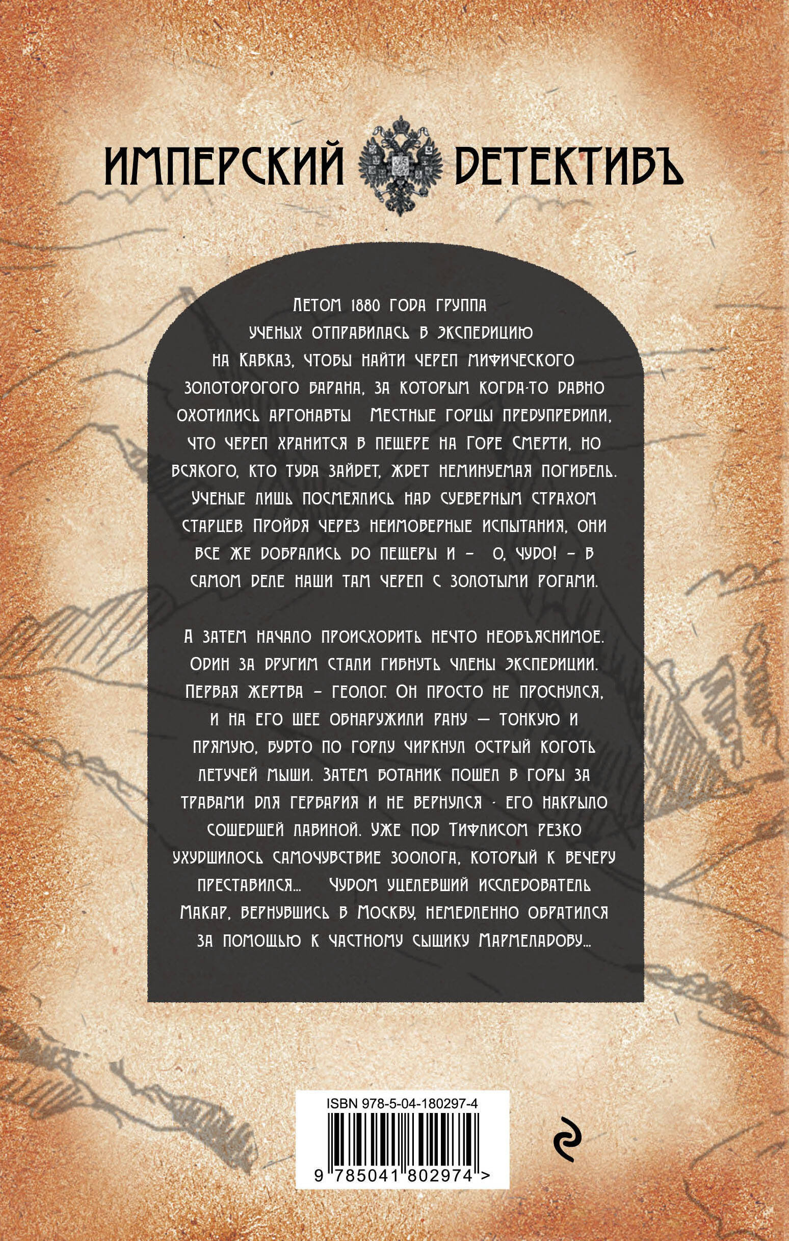 Летом 1880 года группа ученых отправилась в экспедицию на Кавказ, чтобы найти череп мифического золоторогого барана, за которым когда-то давно охотились аргонавты. Местные горцы предупредили, что череп хранится в пещере на Горе Смерти, но всякого, кто туда зайдет, ждет неминуемая погибель. Ученые лишь посмеялись над суеверным страхом старцев. Пройдя через неимоверные испытания, они все же добрались до пещеры и - о, чудо! - в самом деле нашли там череп с золотыми рогами. А затем начало происходить нечто необъяснимое. Один за другим стали гибнуть члены экспедиции. Первая жертва - геолог. Он просто не проснулся, и на его шее обнаружили рану - тонкую и прямую, будто по горлу чиркнул острый коготь летучей мыши. Затем ботаник пошел в горы за травами для гербария и не вернулся - его накрыло сошедшей лавиной. Уже под Тифлисом резко ухудшилось самочувствие зоолога, который к вечеру преставился… Чудом уцелевший исследователь Макар, вернувшись в Москву, немедленно обратился за помощью к частному сыщику Мармеладову… Полное погружение в атмосферу старой Москвы XIX века - с ее вычурными манерами, купеческим удальством и звериной жестокостью… Стасс Бабицкий - журналист и писатель, родился на Байкале, вырос на Кавказе, больше 20 лет живет в двух любимых городах - Москве и Петербурге. Долгие годы работал в газете «Комсомольская правда», в настоящее время сотрудничает с журналом «Антенна-Телесемь». Изучением исторических документов увлекся десять лет назад, когда начал составлять генеалогическое древо семьи. С тех пор каждый отпуск проводит исключительно в архивах различных городов и ведомств, отыскивая не только эмоциональные свидетельства очевидцев ушедшей эпохи, но и сюжеты для новых детективов.