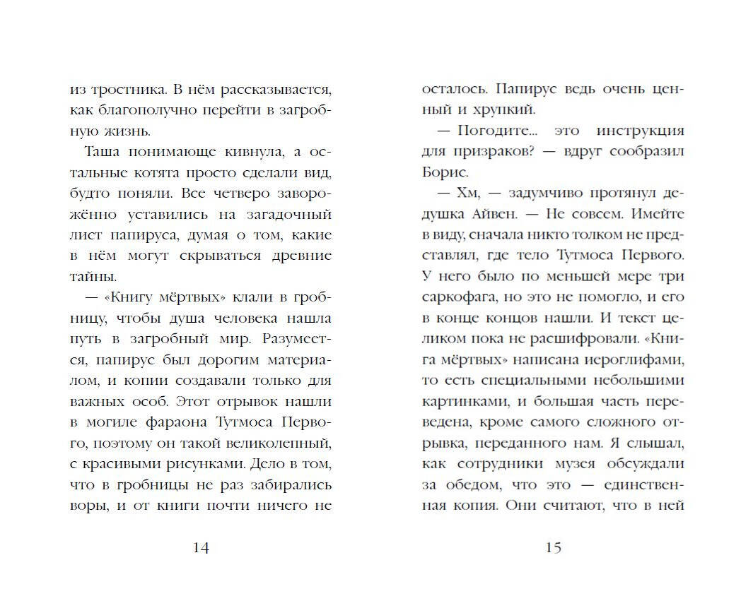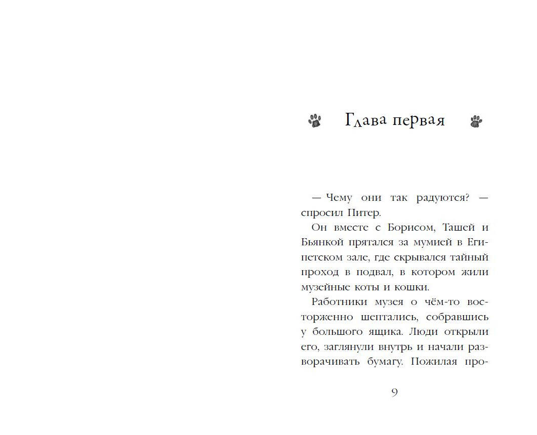 Кошку Ташу преследуют неприятности. Она уверена, что всё это из-за зловещего папируса. Его привезли на выставку в музей, но нарисованы на нём не люди, а кошки! Справится ли Таша с этой загадкой, узнает ли секрет проклятого папируса? Истории Холли Вебб всегда мудрые, поучительные без назидания и очень жизнеутверждающие (а ещё в них всё всегда заканчивается замечательно!). Поэтому она популярна во всём мире, но особенно её полюбили в России, где книги писательницы продаются миллионными тиражами. Холли Вебб тоже любит российских читателей, а на создание этой серии её вдохновило посещение Эрмитажа и знакомство с эрмитажными котами! На обложке этой книги пушистый и очаровательный котёнок. А внутри - белая бумага, крупный шрифт и очень красивые чёрно-белые иллюстрации.| Издательство | ООО "Издательство "Эксмо" |
