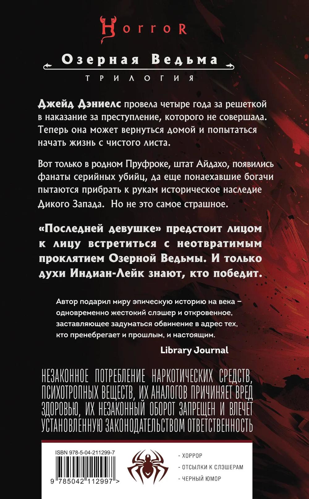 СОДЕРЖИТ ИНФОРМАЦИЮ О НАРКОТИЧЕСКИХ ИЛИ ПСИХОТРОПНЫХ ВЕЩЕСТВАХ, УПОТРЕБЛЕНИЕ КОТОРЫХ ОПАСНО ДЛЯ ЗДОРОВЬЯ. ИХ НЕЗАКОННЫЙ ОБОРОТ ВЛЕЧЕТ УГОЛОВНУЮ ОТВЕТСТВЕННОСТЬ. Четыре года назад Джейд Дэниэлс взяла на себя вину, чтобы защитить подругу Лету. Закончился тюремный срок, и она возвращается в родной город. В Пруфроке у нее много незавершенных дел, начиная с культистов, которые поклоняются серийным убийцам, и заканчивая богачами, пытающимися купить культуру американского Запада. Но есть одна сторона жизни Пруфрока, с которой никто не хочет сталкиваться... пока в город не вернется Джейд. Проклятье Озерной Ведьмы ждет своего часа, и теперь настало время для решающей битвы. Эпическая трилогия ужасов о травмах поколений и украденной надежде. Это история американского Запада, написанная кровью. А еще - история одной девушки, которая не может позволить себе сдаться.| Издательство | Эксмо |