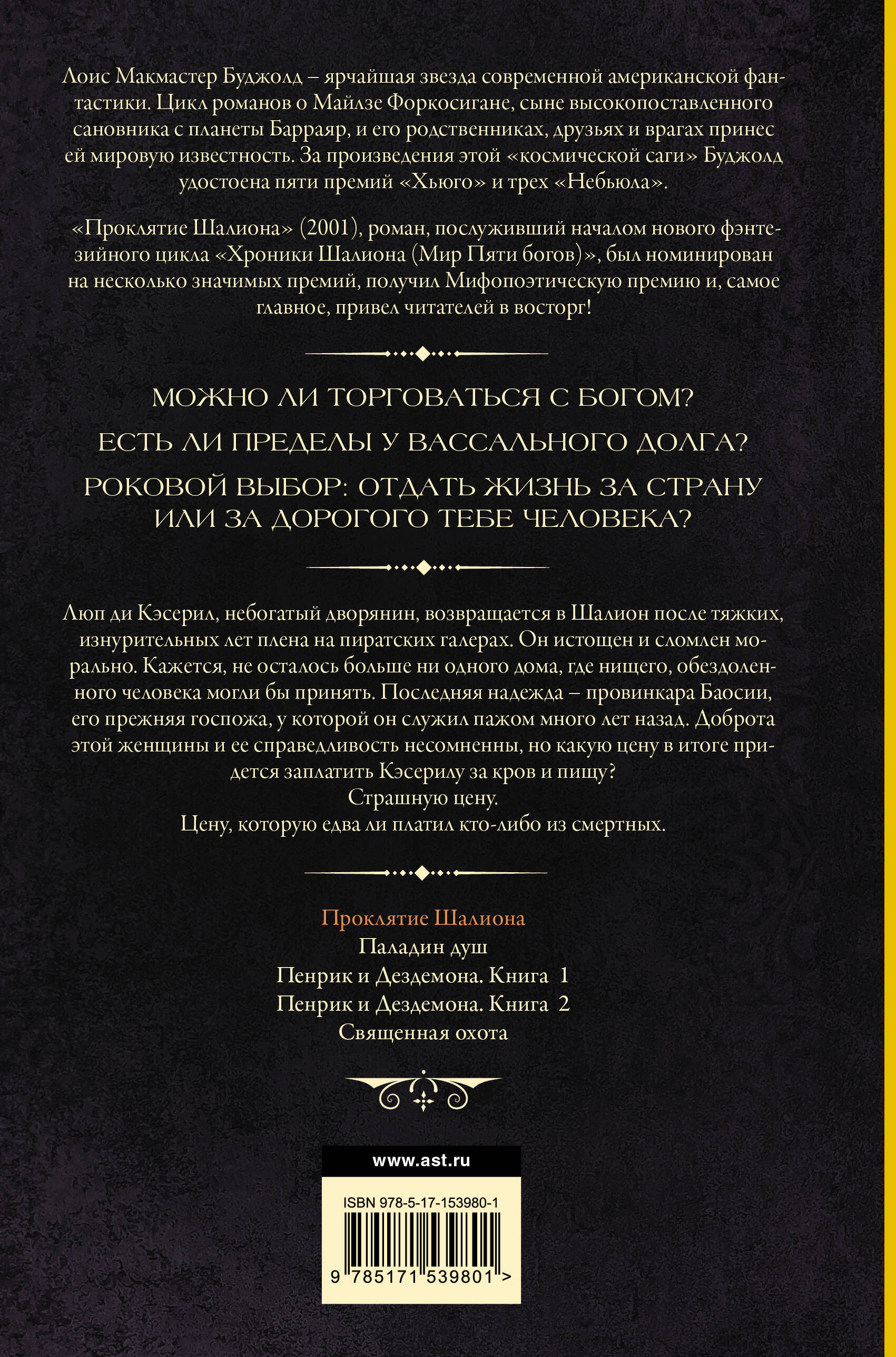 "Проклятие Шалиона" (2001), роман, послуживший началом нового фэнтезийного цикла "Хроники Шалиона (Мир Пяти богов)", был номинирован на несколько значимых премий, получил Мифопоэтическую премию, и, самое главное, привел читателей в восторг! Люп ди Кэсерил, небогатый дворянин, возвращается в Шалион после тяжких, изнурительных лет плена на пиратских галерах. Он истощен и сломлен морально. Кажется, не осталось больше ни одного дома, где нищего обездоленного человека могли бы принять. Последняя надежда - провинкара Баосии, его прежняя госпожа, у которой он служил пажом много лет назад. Доброта этой женщины и ее справедливость несомненны, но какую цену в итоге придется заплатить Кэсерилу за кров и пищу? Страшную цену. Цену, которую едва ли платил кто-либо из смертных.| Издательство | Издательство "АСТ" |