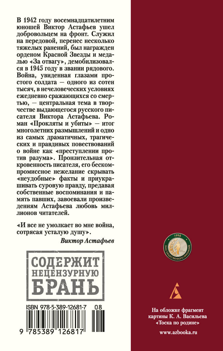 В 1942 году восемнадцатилетним юношей Виктор Астафьев ушел добровольцем на фронт. Служил на передовой, перенес несколько тяжелых ранений, был награжден орденом "Красной Звезды" и медалью "За отвагу", демобилизовался в 1945 году в звании "рядовой". Война, увиденная глазами простого солдата - одного из сотен тысяч, в нечеловеческих условиях ежедневно сражающихся со смертью, - центральная тема в творчестве выдающегося русского писателя Виктора Астафьева. Роман "Прокляты и убиты" - итог многолетних размышлений и одно из самых драматичных, трагических и правдивых повествований о войне, как "преступлении против разума". Пронзительная откровенность писателя, его бескомпромиссное нежелание скрывать "неудобные" факты и приукрашивать суровую правду, предавая собственные воспоминания и память павших, завоевали произведениям Астафьева любовь миллионов читателей.