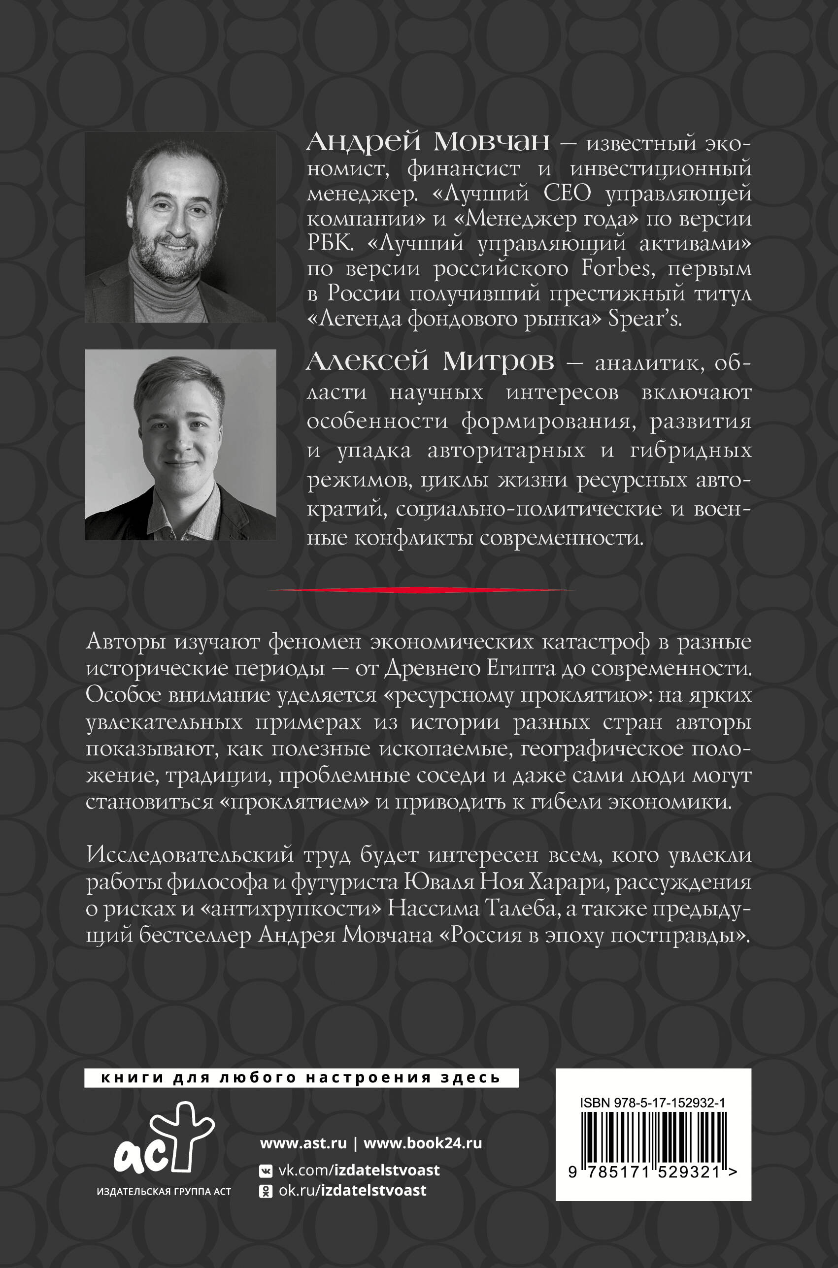 Андрей Мовчан - известный экономист, финансист и инвестиционный менеджер, «Лучший управляющий активами» по версии российского Forbes, первым в России получивший престижный титул «Легенда фондового рынка» Spear's. Алексей Митров - аналитик, изучающий особенности формирования, развития и упадка авторитарных и гибридных режимов. Авторы изучают феномен экономических катастроф в разные исторические периоды - от Древнего Египта до современности. Особое внимание уделяется «ресурсному проклятию»: на ярких увлекательных примерах из истории разных стран авторы показывают, как полезные ископаемые, географическое положение, традиции, проблемные соседи и даже сами люди могут становиться «проклятием» и приводить к гибели экономики. Книга вошла в шорт-лист престижной премии «Просветитель».| Издательство | ИЗДАТЕЛЬСТВО "АСТ" |