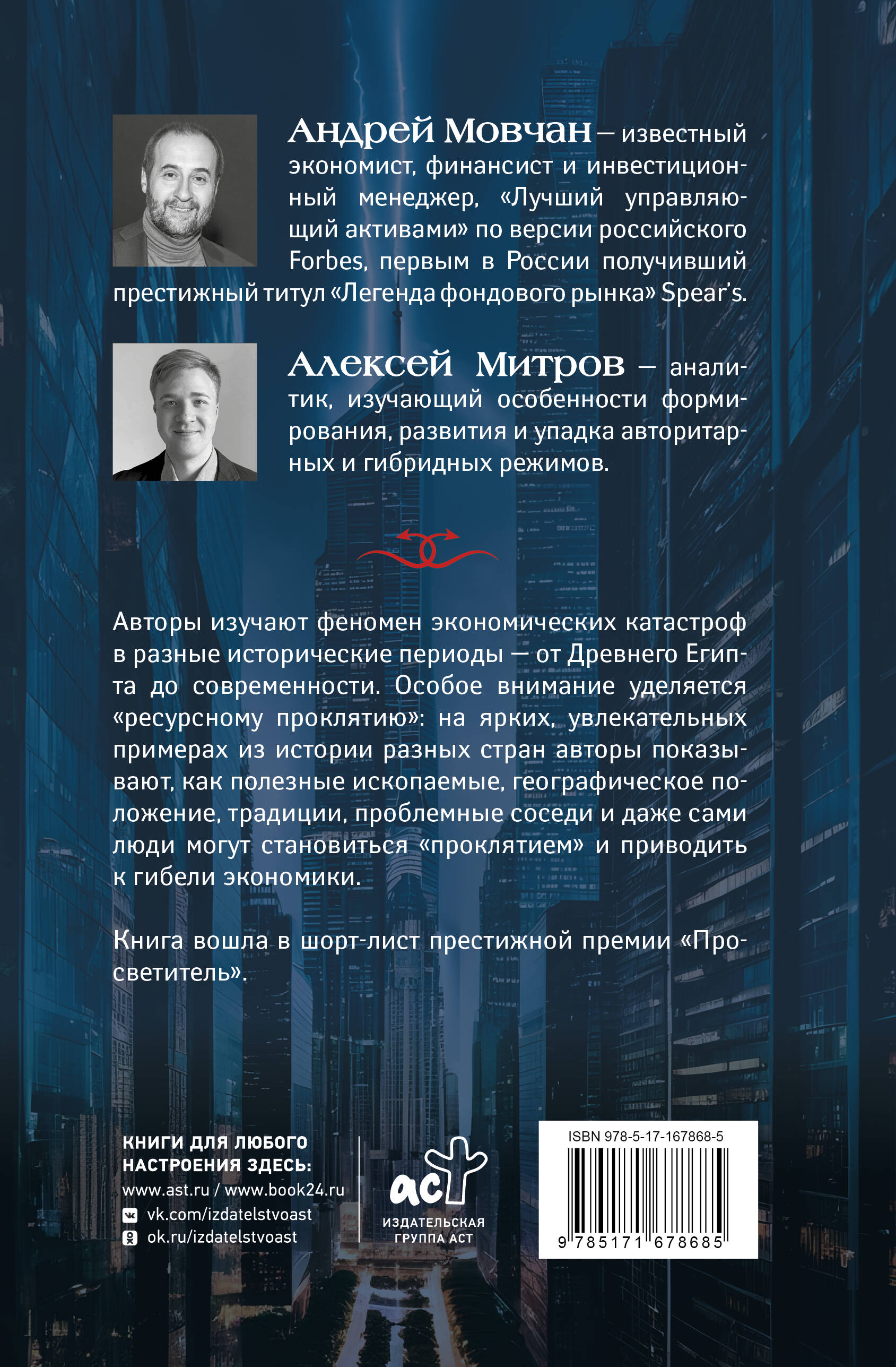 Андрей Мовчан - известный экономист, финансист и инвестиционный менеджер, «Лучший управляющий активами» по версии российского Forbes, первым в России получивший престижный титул «Легенда фондового рынка» Spear's. Алексей Митров - аналитик, изучающий особенности формирования, развития и упадка авторитарных и гибридных режимов. Авторы изучают феномен экономических катастроф в разные исторические периоды - от Древнего Египта до современности. Особое внимание уделяется «ресурсному проклятию»: на ярких увлекательных примерах из истории разных стран авторы показывают, как полезные ископаемые, географическое положение, традиции, проблемные соседи и даже сами люди могут становиться «проклятием» и приводить к гибели экономики. Книга вошла в шорт-лист престижной премии «Просветитель».| Издательство | Издательство "АСТ" |