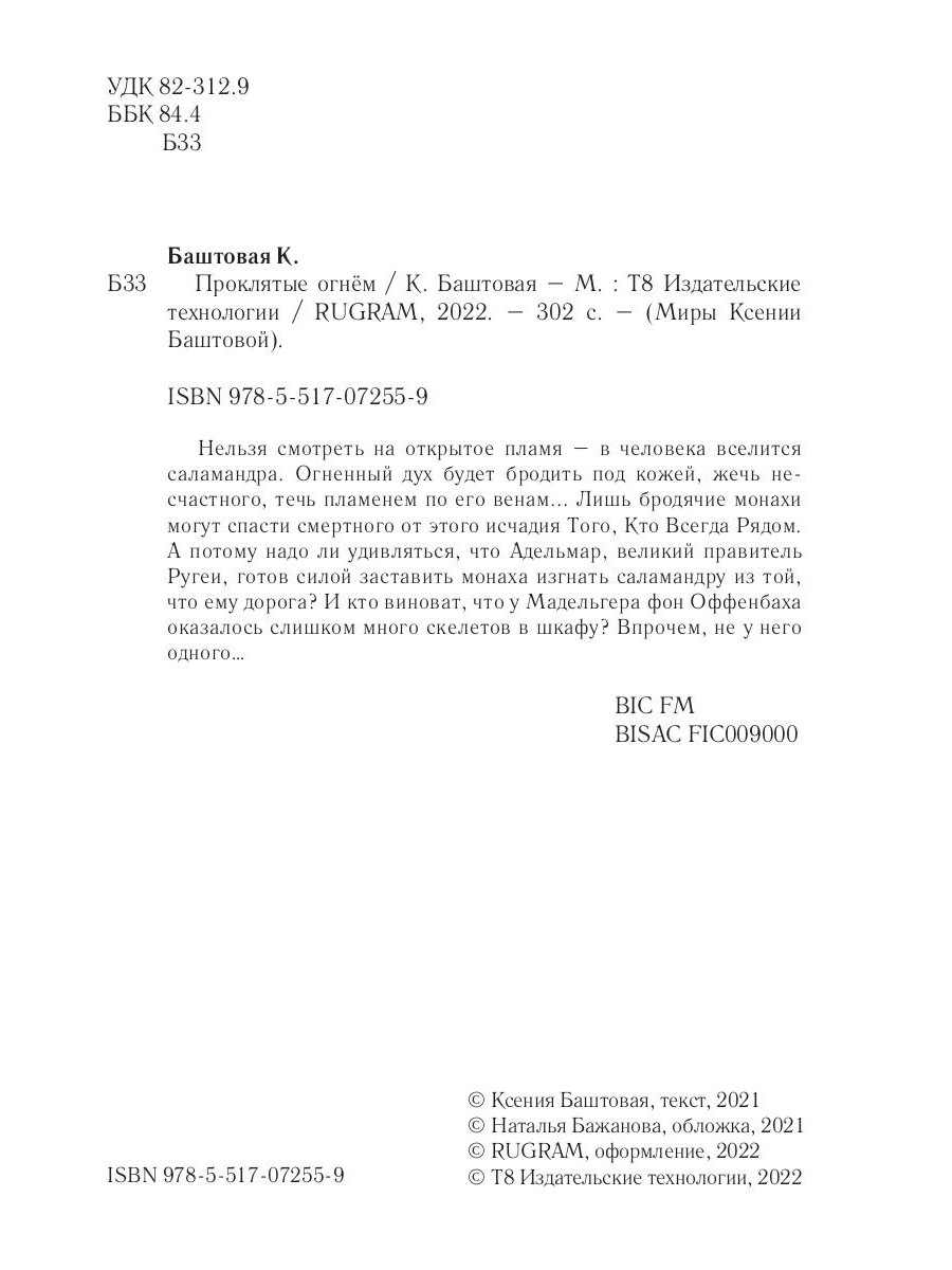 Нельзя смотреть на открытое пламя - в человека вселится саламандра. Огненный дух будет бродить под кожей, жечь несчастного, течь пламенем по его венам... Лишь бродячие монахи могут спасти смертного от этого исчадия Того, Кто Всегда Рядом. А потому надо ли удивляться, что Адельмар, великий правитель Ругеи, готов силой заставить монаха изгнать саламандру из той, что ему дорога? И кто виноват, что у Мадельгера фон Оффенбаха оказалось слишком много скелетов в шкафу? Впрочем, не у него одного…| Издательство | Т8 RUGRAM |