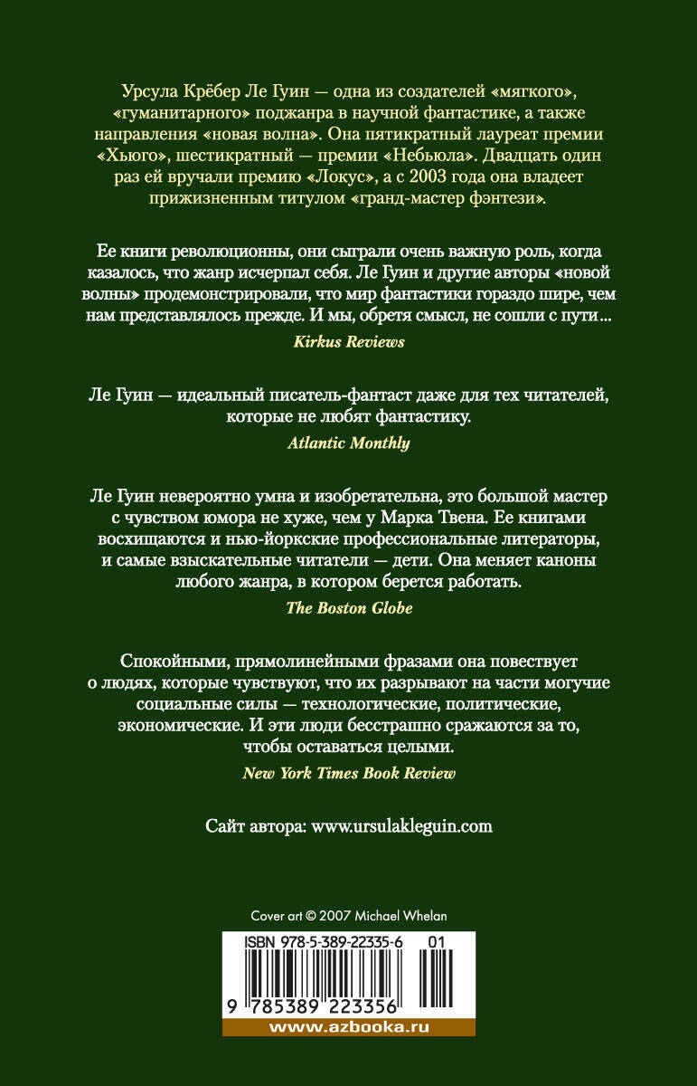 Горцы Верхних Земель, на вид обычные крестьяне, обладают магическими способностями, как благотворными, так и опасными. Но при этом они никак не могут выбиться из нужды и живут в постоянном страхе: что, если одна из семей обратит против другой свой гибельный дар?.. Мирный город Ансул гордился своими библиотеками, школами и храмами, пока его не захватили альды, фанатичные варвары-демоноборцы. Считая культуру бесовским наваждением, они даже чтение и письмо запретили под страхом смертной казни. Но человеку, которого целый год держали в тюрьме и увечили пытками, удалось сохранить несколько драгоценных книг… Юный Гэвир предвидит будущее, но не может предотвратить катастрофу, грозящую его миру - миру, в котором он вырос рабом. Обретя свободу, которой никогда не желал, он отправляется в неизвестность… Вошедший в сборник роман "Голоса" удостоен в 2005 году премии американского ПЕН-центра, а роман "Прозрение" - премии "Небьюла" в 2008 году.| Издательство | Азбука-Аттикус Издат.группа ООО |