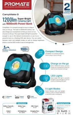 PROMATE CampMate-3 походная лампа достаточно компактена - её можно положить в сумку или взять с собой в дорогу. Встроенная батарея емкостью 9000 мАч также может заряжать ваш смартфон. Яркий светодиодный свет достаточно мощный, чтобы использовать его в самых темных условиях в качестве мощного фонарика или мигающего устройства оповещения SOS. Вы можете переключаться между теплым и дневным режимами, а также изменть яркость или использовать режим SOS в случае чрезвычайных ситуаций.