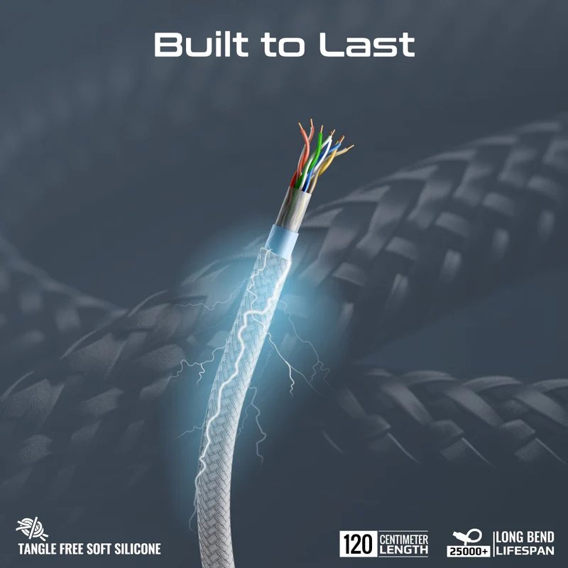 - Надежный снаружи: Износостойкая ПВХ оболочка в нейлоновой оплетке и протекторы возле коннекторов выдерживают более 10000 сгибаний.