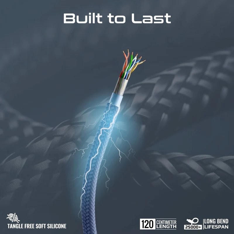 - Надежный снаружи: Износостойкая ПВХ оболочка в нейлоновой оплетке и протекторы возле коннекторов выдерживают более 10000 сгибаний.
