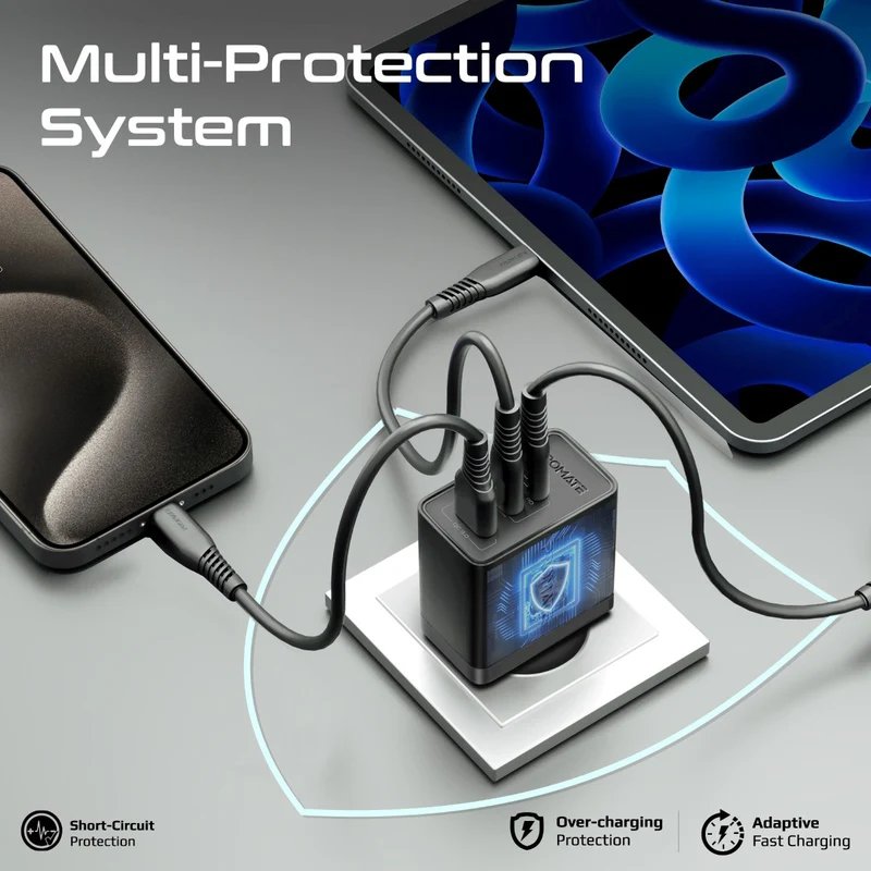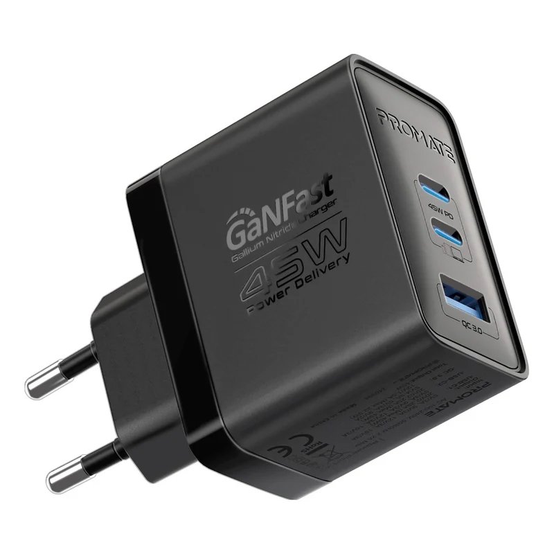 Promate PowerPort-45 - адаптер TriplePort, который превращает каждую розетку в глобальный центр питания. Оснащенный технологией GaNFast™ и имеет мощность двух портов USB-C™ PD45W, а порт USB PD22.5W QC 3.0 зарядит все ваши устройства в короткие сроки.