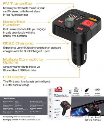 Bluetooth FM-передатчик PROMATE PowerTune-30W - это устройство, которое сделает любую поездку более удобной. Теперь вам не нужно думать о дополнительных шнурах и подключении их к телефону, чтобы послушать музыку или поговорить с человеком по автомобильному радио. Ваше устройство позволяет подключаться к телефону с помощью Bluetooth. Устройство оснащено 3 выходами USB, один из которых оснащен технологией быстрой зарядки QC3.0, а другой порт оснащен технологией PowerDelivery PD30W.