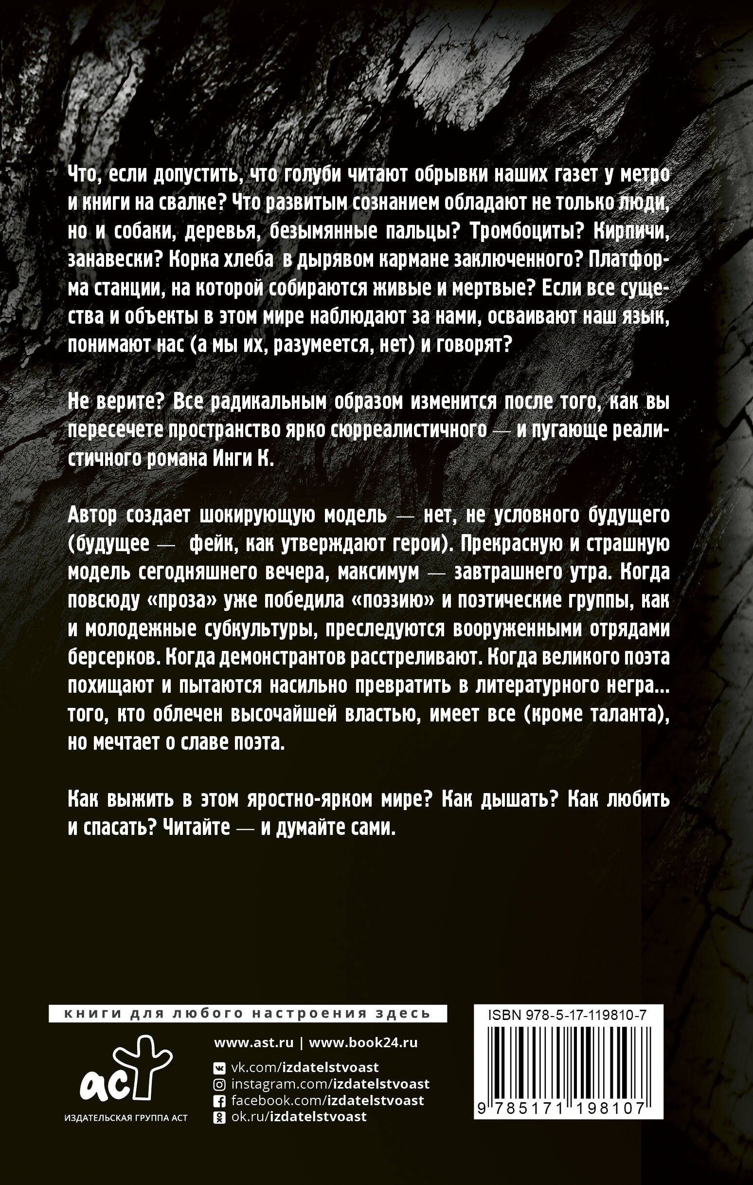 Что, если допустить, что голуби читают обрывки наших газет у метро и книги на свалке? Что развитым сознанием обладают не только люди, но и собаки, деревья, безымянные пальцы? Тромбоциты? Кирпичи, занавески? Корка хлеба в дырявом кармане заключенного? Платформа станции, на которой собираются живые и мертвые? Если все существа и объекты в этом мире наблюдают за нами, осваивают наш язык, понимают нас (а мы их, разумеется, нет) и говорят? Не верите? Все радикальным образом изменится после того, как вы пересечете пространство ярко сюрреалистичного - и пугающе реалистичного романа Инги К. Автор создает шокирующую модель - нет, не условного будущего (будущее - фейк, как утверждают герои). Прекрасную и страшную модель сегодняшнего вечера, максимум - завтрашнего утра. Когда повсюду «проза» уже победила «поэзию», и поэтические группы, как и молодежные субкультуры, преследуются вооруженными отрядами берсерков. Когда демонстрантов расстреливают. Когда великого поэта похищают и пытаются насильно превратить в литературного негра… того, кто облечен высочайшей властью, имеет все (кроме таланта), но мечтает о славе поэта. Как выжить в этом яростно-ярком мире? Как дышать? Как любить и спасать? Читайте - и думайте сами. Инга Кузнецова - поэт и прозаик, переведенный на восемь языков мира, лауреат премий «Триумф» и «Московский счет». Автор пяти поэтических книг и нашумевшего романа «Пэчворк» (2017). «Промежуток» - второй роман автора.| Издательство | Издательство "АСТ" |