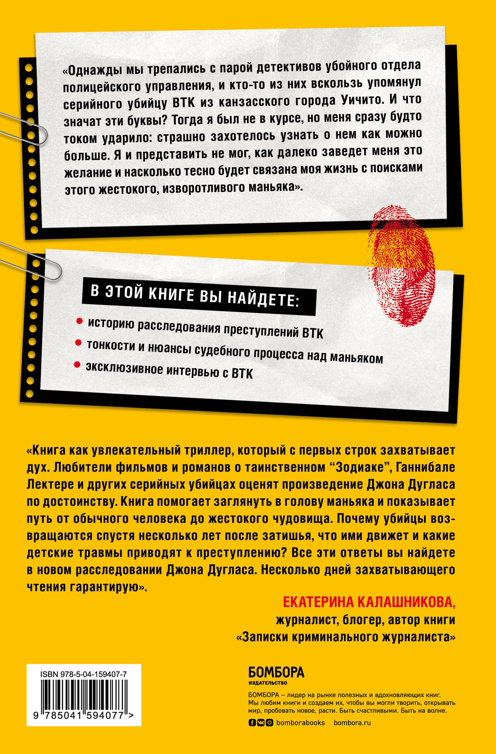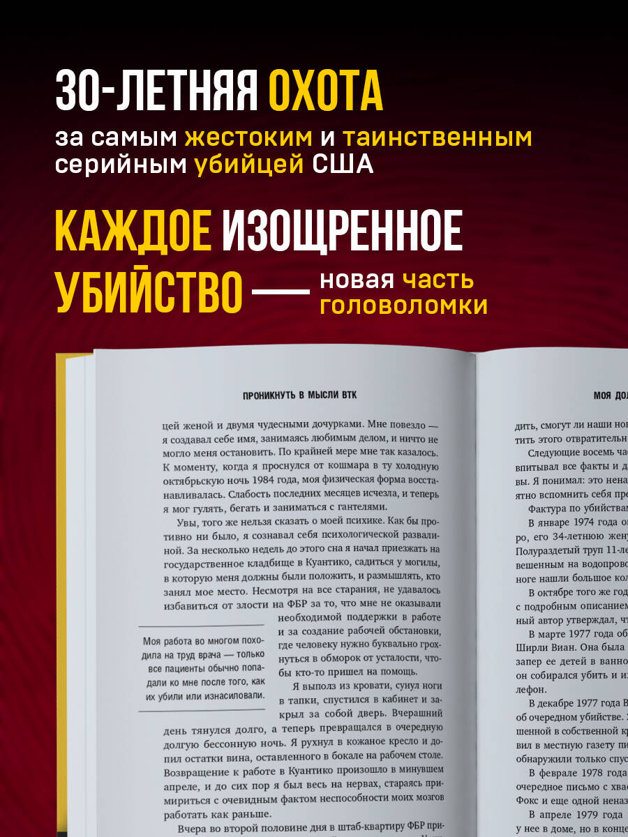 ВТК… Больше 30 лет человек под этим псевдонимом держал в страхе целый город. Он внезапно появлялся и так же внезапно исчезал, попутно играя в кошки-мышки с полицией, отправляя им издевательские самовлюбленные послания. К счастью, именно это качество его и погубило. Джон Дуглас - один из первых криминалистов-профайлеров, который занимался этим делом с самого начала. В своих книгах автор делится информацией о том, как устроены мозг и сознание убийц, чтобы развеять мифы вокруг них и дать возможность читателям защитить себя и окружающих от возможного появления новых жестоких преступников. В этой книги вы найдете: - историю расследования преступлений BTK; - тонкости и нюансы судебного процесса над маньяком; - эксклюзивное интервью с BTK.| Издательство | Эксмо |