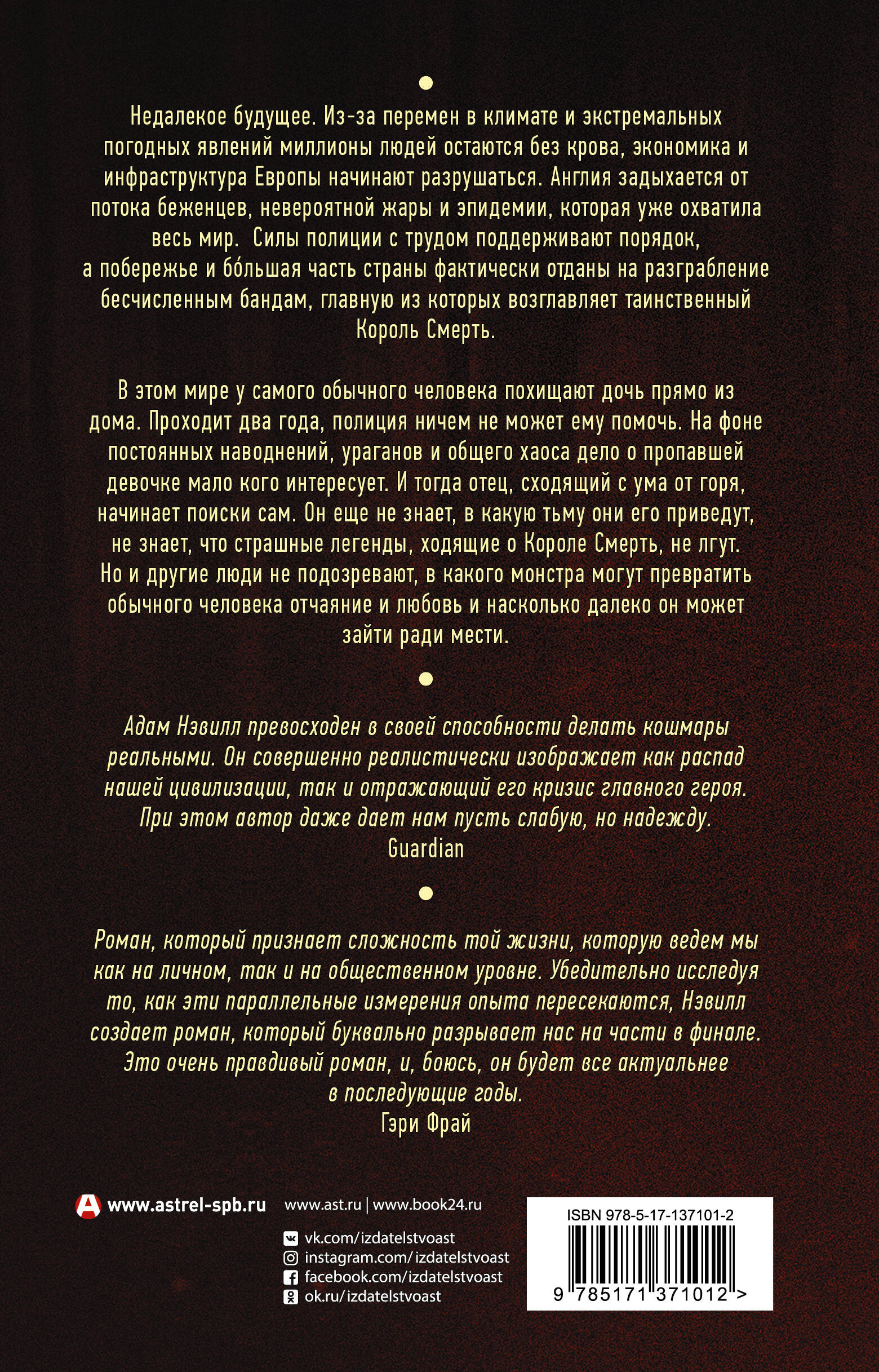 Недалекое будущее. Из-за перемен в климате и экстремальных погодных явлений миллионы людей остаются без крова, экономика и инфраструктура Европы начинают разрушаться. Англия задыхается от потока беженцев, невероятной жары и эпидемии, которая уже охватила весь мир. Силы полиции с трудом поддерживают порядок, а побережье и бо льшая часть страны фактически отданы на разграбление бесчисленным бандам, главную из которых возглавляет таинственный Король Смерть. В этом мире у самого обычного человека похищают дочь прямо из дома. Проходит два года, полиция ничем не может ему помочь. На фоне постоянных наводнений, ураганов и общего хаоса дело о пропавшей девочке мало кого интересует. И тогда отец, сходящий с ума от горя, начинает поиски сам. Он еще не знает, в какую тьму они его приведут, не знает, что страшные легенды, ходящие о Короле Смерть, не лгут. Но и другие люди не подозревают, в какого монстра могут превратить обычного человека отчаяние и любовь и насколько далеко он может зайти ради мести.| Издательство | ИЗДАТЕЛЬСТВО "АСТ" |