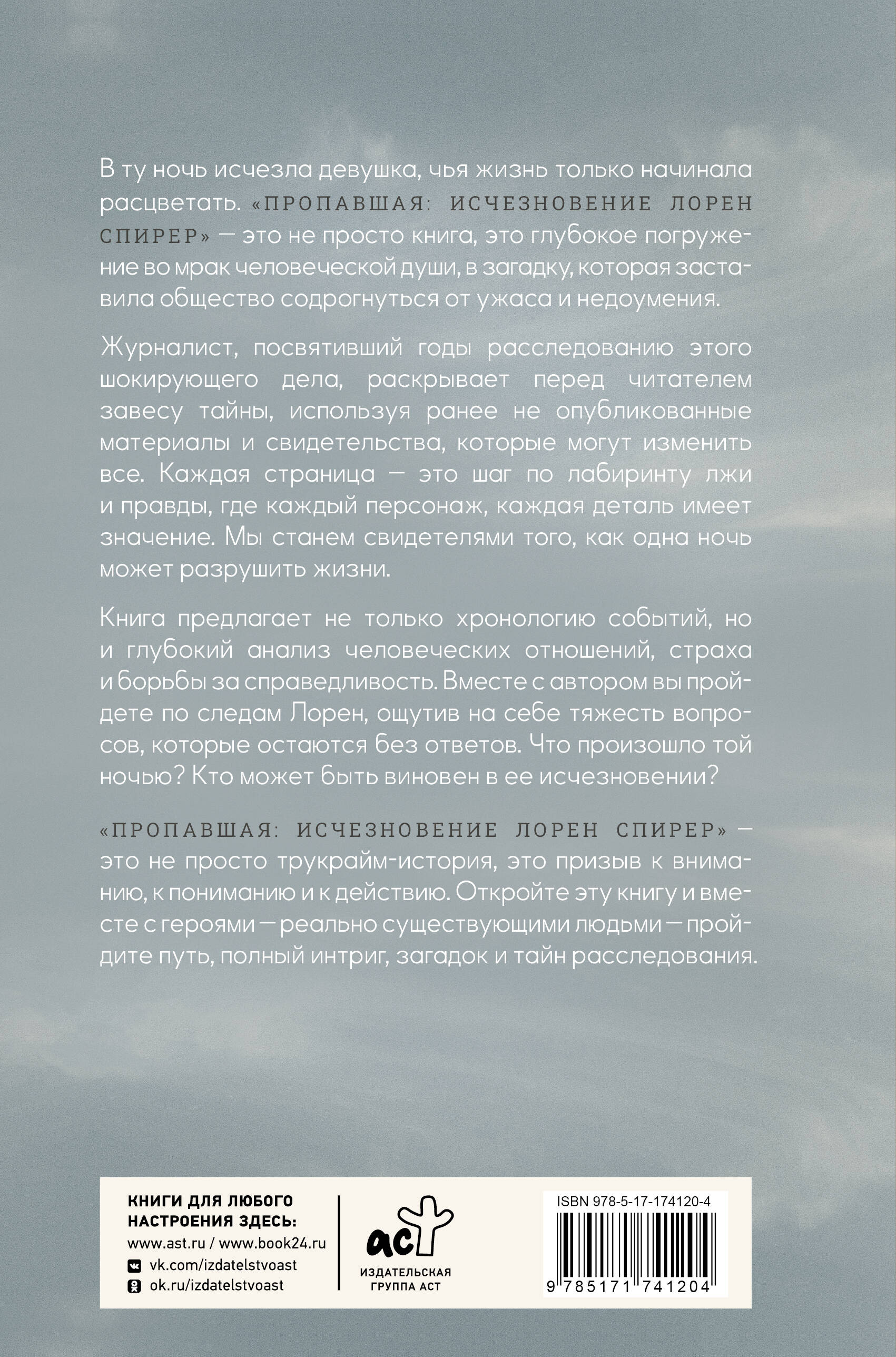 В ту ночь исчезла девушка, чья жизнь только начинала расцветать. "Пропавшая: Исчезновение Лорен Спирер" - это не просто книга, это глубокое погружение во мрак человеческой души, в загадку, которая заставила общество содрогнуться от ужаса и недоумения. Журналист, посвятивший годы расследованию этого шокирующего дела, раскрывает перед читателем завесу тайны, используя ранее неопубликованные материалы и свидетельства, которые могут изменить всё. Каждая страница - это шаг по лабиринту лжи и правды, где каждый персонаж, каждая деталь имеет значение. Мы станем свидетелями того, как одна ночь может разрушить жизни. Книга предлагает не только хронологию событий, но и глубокий анализ человеческих отношений, страха и борьбы за справедливость. Вместе с автором вы пройдёте по следам Лорен, ощутив на себе тяжесть вопросов, которые остаются без ответов. Что произошло той ночью? Кто может быть виновен в её исчезновении? "Пропавшая: Исчезновение Лорен Спирер" - это не просто трукрайм история, это призыв к вниманию, к пониманию и к действию. Откройте эту книгу, и вместе с героями - реально существующими людьми - пройдите путь, полный интриг, загадок и тайн расследования.| Издательство | Издательство "АСТ" |
