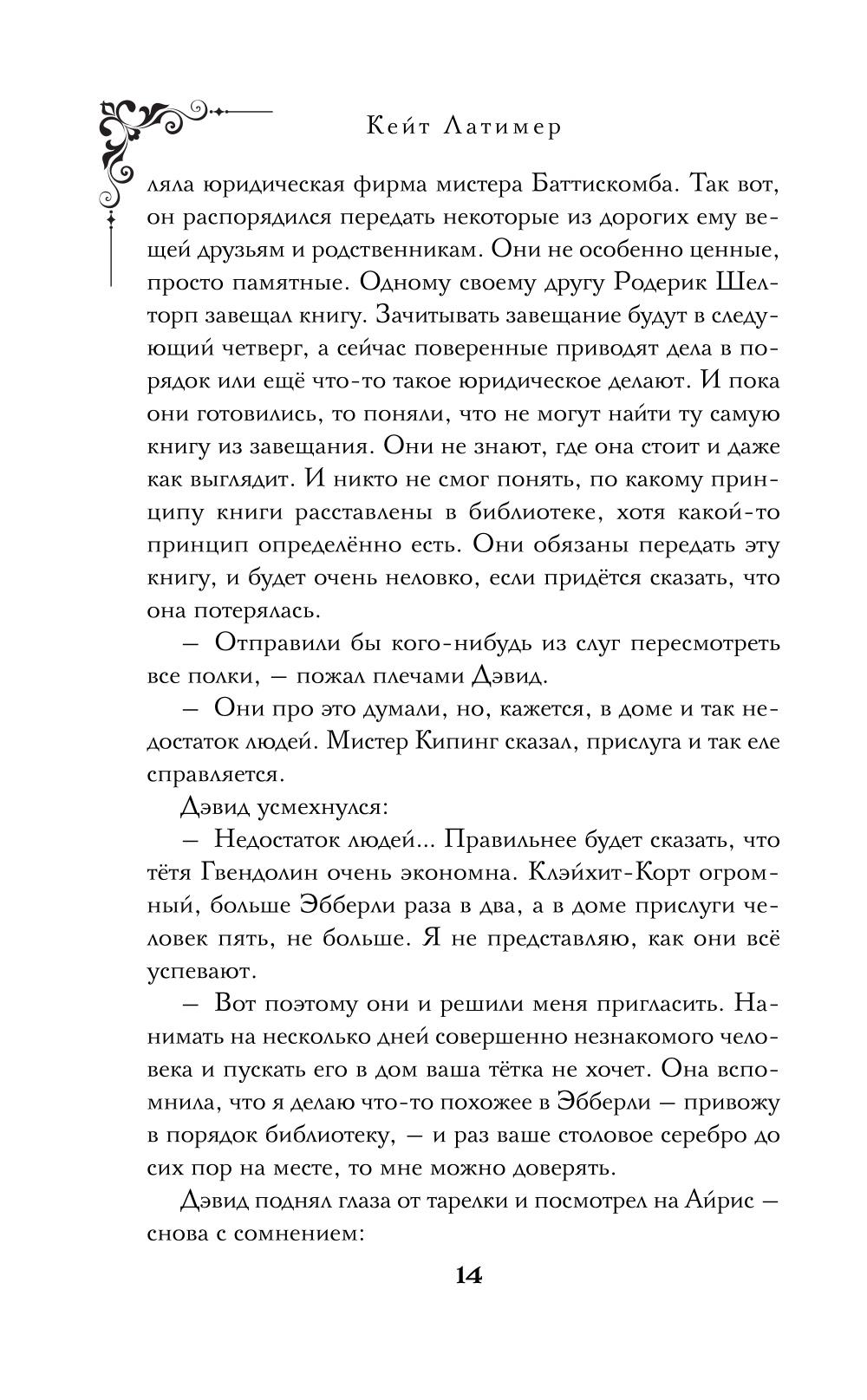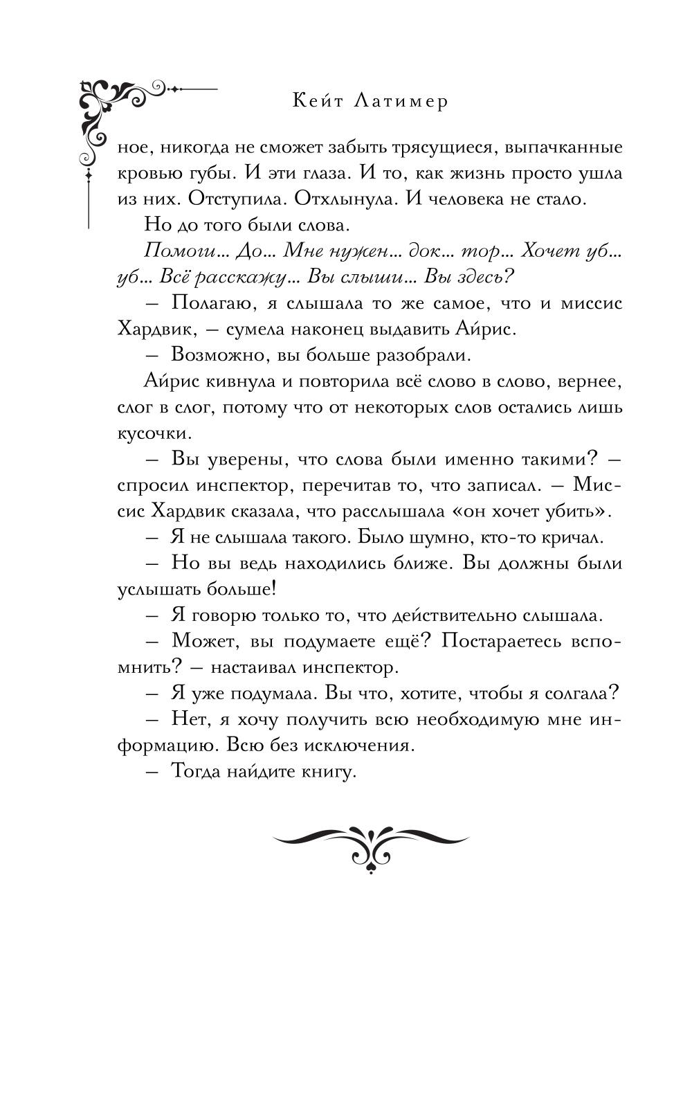Иногда книги сами выбирают читателя - и ведут его за собой. Айрис Бирн получает приглашение в Клэйхит-Корт - старинный особняк XVI века, весь будто состоящий из потайных лестниц, холодных коридоров и огромных окон. У владельцев дома исчезает редкий экземпляр романа «Ворон вещей» Питера Этериджа. А вскоре здесь погибает один из гостей. Клэйхит-Корт захлопывается, как шкатулка с секретом. У каждого из его обитателей своя причина молчать и свой ключ к разгадке. Убийца кто-то из них, и все нити тянутся к пропавшей книге. Одни стараются ее заполучить, другие - уничтожить. Что за тайну она хранит? И кто ради нее готов пойти на убийство? Новая книга серии «Убийство в высшем обществе» Кейт Латимер в духе Агаты Кристи и Дафны дю Морье!| Издательство | Эксмо |