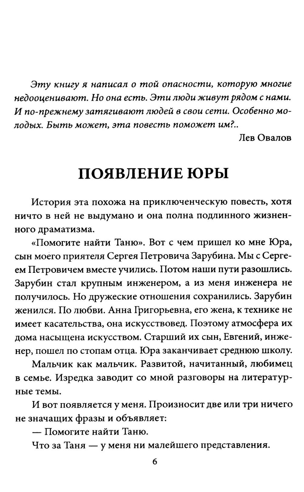 Эту книгу классик советской приключенческой литературы писатель Лев Сергеевич Овалов (1905 - 1997) считал своим лучшим произведением. Он создавал ее на документальном материале, глубоко изучив жестокий подпольный мир советских сектантов, их преступления, от описания которых леденеет кровь в жилах. Дело в том, что Овалову удалось вытащить из лап сектантов одну девушку, помог ей вернуться в мир. Герои его книг - современные советские люди. Но каждый из них может стать жертвой тоталитарной секты. Изуверы давно отработали методы втягивания людей в свой омут. Они хитры и коварны. Овалов показывает преступную сеть, которую создали сектанты, заманивая в свои ряды тех, кто пал духом, кто дрогнул. Книга актуальная и в наше время, когда снова активны «ловцы душ человеческих», способные на любые преступления.