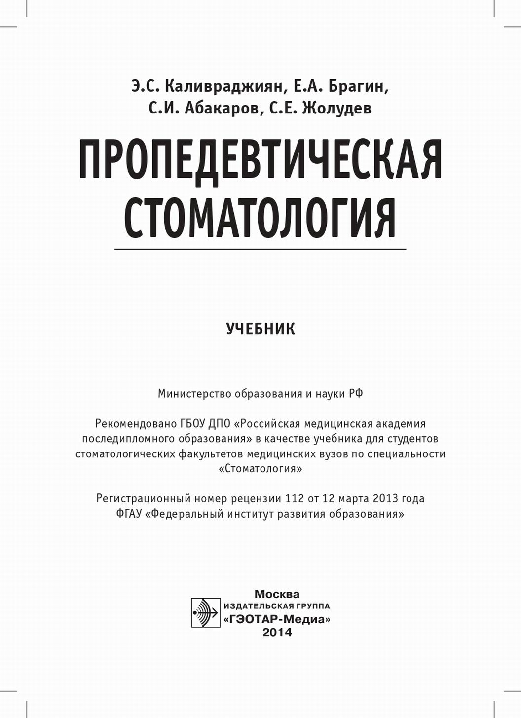 Учебник написан согласно федеральному государственному образовательному стандарту 3-го поколения с учетом современного уровня развития стоматологической науки и практики. В книге представлены основные разделы стоматологической дисциплины "Стоматология. Пропедевтика"; приведены сведения о функциональной анатомии и физиологии челюстно-лицевой области; изложены методы обследования пациента, включая вопросы медицинской этики и деонтологии; рассмотрены организация и оборудование стоматологического кабинета, стоматологический инструментарий. В учебник включены современные данные по кариесологии, эндодонтии и различным видам обезболивания в стоматологии, освещены принципы препарирования твердых тканей и операции удаления зуба. Большое внимание уделено методам восстановления анатомической формы зуба, способам коррекции дефектов зубных рядов. Предназначен студентам I-II курсов стоматологических факультетов медицинских вузов.| Издательство | ГЭОТАР-Медиа |