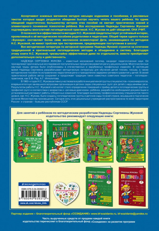 Для правильного чтения и письма, а также исправления ошибок в речи, для детей необходима только проверенная и прогрессивная, основанная на многолетнем опыте методика. В основе обучения письму по методике Надежды Жуковой лежит слоговой принцип русской графики. Для удобства обучения материал прописей разделен на 3 тетради, с которыми желательно работать последовательно. Прописи являются приложением к знаменитому «Букварю» Надежды Жуковой, который успешно используют все родители, воспитатели и педагоги. Об авторе методики: Надежда Сергеевна Жукова - известный логопед, кандидат педагогических наук, приверженец классической педагогики. В своих книгах она использовала как исследования известных логопедов, так и самостоятельно разработанные оригинальные методики, проверенные временем. Имея большой практический опыт работы с особенными, «трудными» детьми, Надежда Сергеевна создала методику, доступную каждому, уйдя от «наукообразности» и «заумности». Все, кто когда-либо работал с ребенком по пособиям Надежды Жуковой, отмечают простоту подачи материала, легкость усвоения малышами и быструю обучаемость. Если вы захотите продолжить занятия с ребенком по авторской программе Н.С. Жуковой, издательство «ЭКСМО» рекомендует вам обратить внимание на следующие книги: - «Букварь», - «Первая после букваря книга для чтения», - «Уроки чистописания и грамотности», - «Я говорю правильно», - «Я пишу правильно», - «Уроки логопеда».| Издательство | Эксмо |