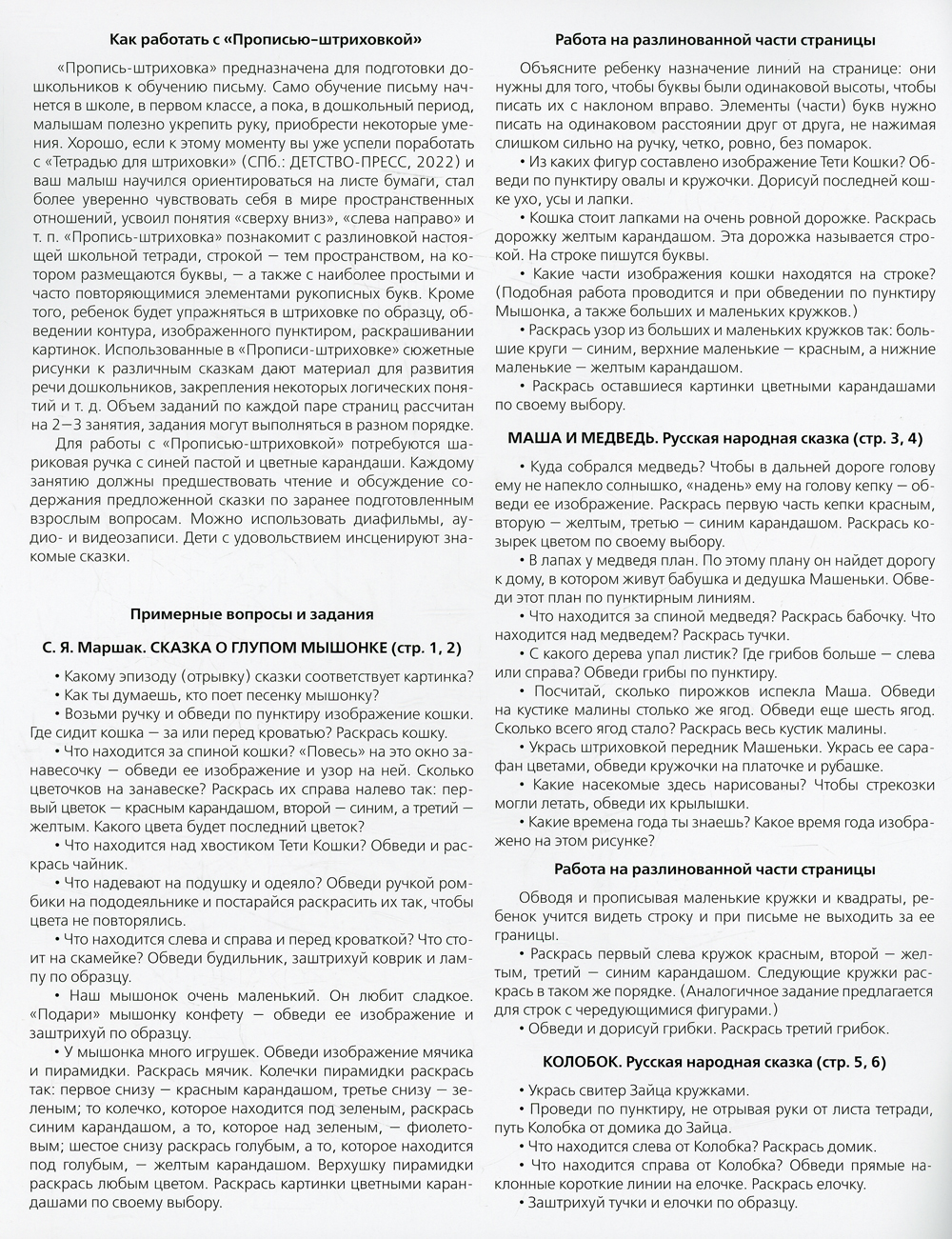 «Пропись-штриховка» предназначена для подготовки дошкольников к обучению письму. Она познакомит малыша с разлиновкой настоящей школьной тетради, строкой - тем пространством, на котором размещаются буквы, - а также с наиболее простыми и часто повторяющимися элементами рукописных букв. Ребенок будет упражняться в штриховке по образцу, обведении контура, изображенного точками, раскрашивании картинок. Сюжетные рисунки к сказкам дают материал для развития речи дошкольников, закрепления некоторых логических понятий и т. д.| Издательство | Детство-Пресс |