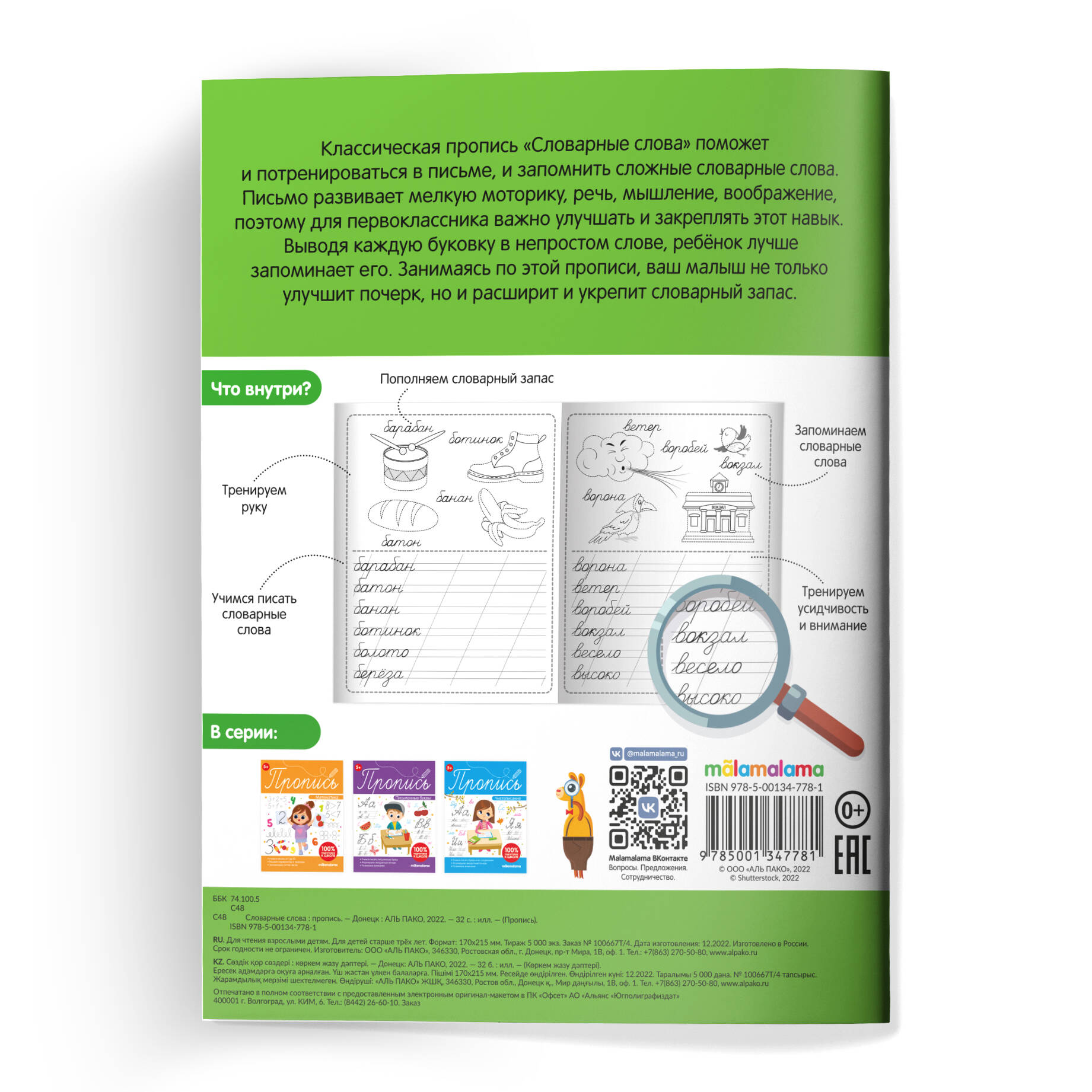 Классическая пропись "Словарные слова" поможет и потренироваться в письме, и запомнить словарные слова. Письмо развивает мелкую моторику, речь, мышление, воображение, поэтому дл япервоклассника важно улучшать и закреплять этот навык. Выводя каждую буковку в непростом слове, ребёнок лучше запоминает его. Занимаясь по этой прописи, ваш малыш не только улучшит почерк, но и расширит и укрепит свой словарный запас.| Издательство | АЛЬ ПАКО ООО |