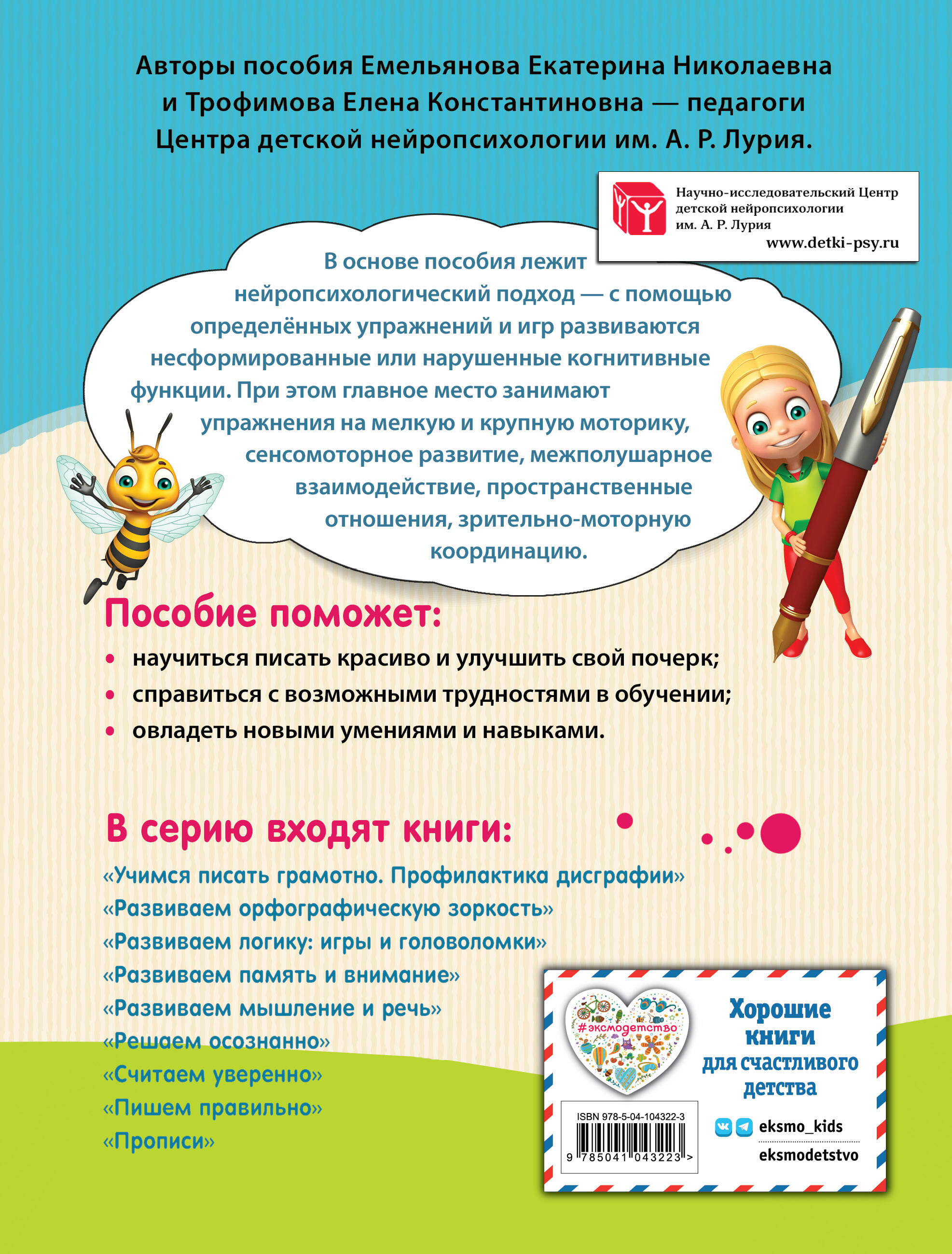 Тренажеры подготовлены практикующими нейропсихологами, которые каждый день помогают справиться с проблемами с обучением, возникающими у детей в начальной школе. Использование пособий в учебном процессе или в качестве дополнительного материала позволит ребенку успешно учиться, своевременно устраняя всевозможные трудности и сложности с освоением школьного материала и формированием необходимых навыков. Нестандартные игровые задания, предлагаемые специалистами Центра детской нейропсихологии им. А.Р. Лурия, помогут развить способности ребенка и справиться с возникающими в процессе учебы затруднениями, а также станут прекрасной профилактикой возможных проблем.| Издательство | ООО "Издательство "Эксмо" |