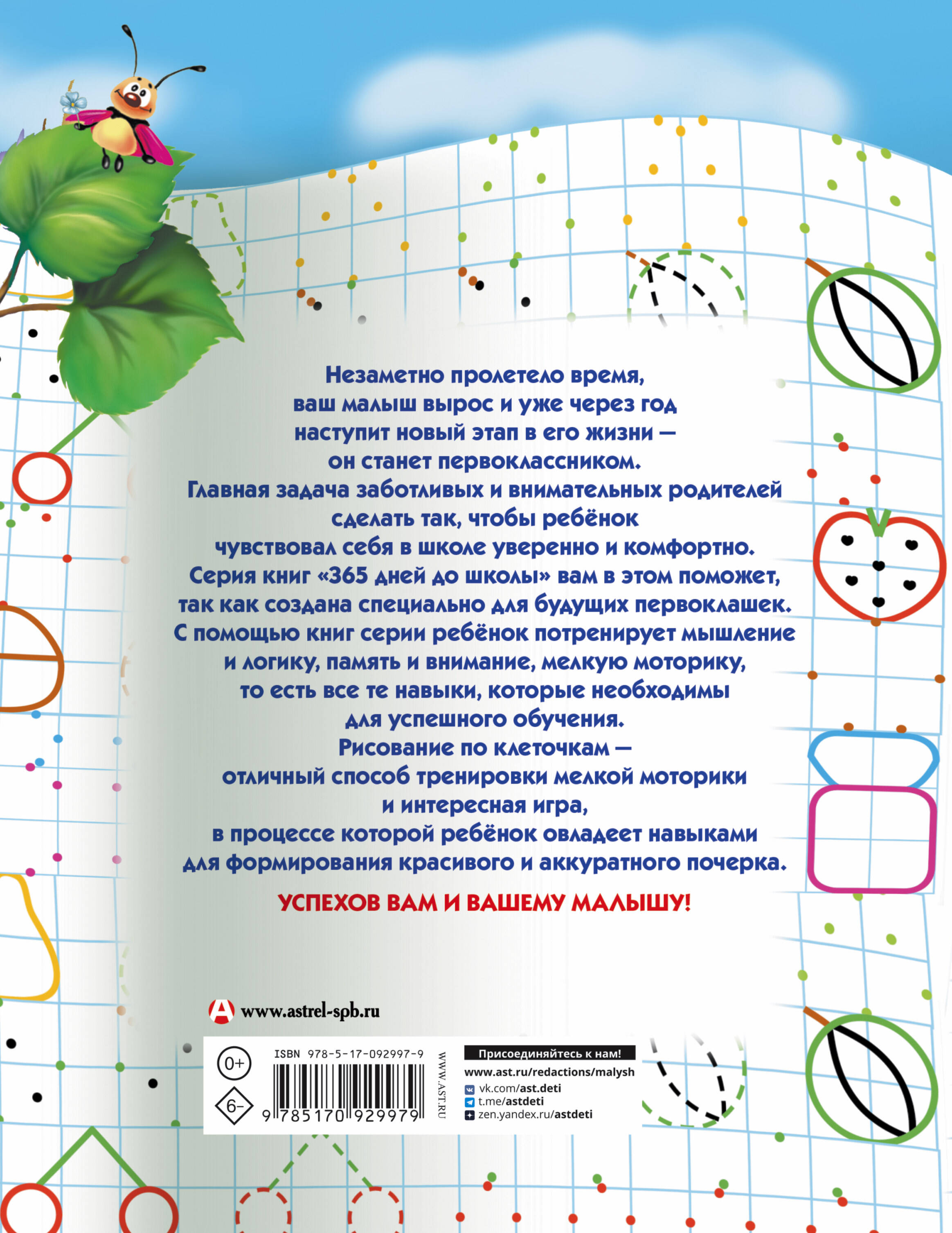 Серия книг "365 дней до школы" создана специально для будущих первоклашек. С помощью книг серии ребенок потренирует мышление и логику, память и внимание, мелкую моторику, то есть все те навыки, которые необходимы для успешного обучения. Рисование по клеточкам - отличный способ тренировки мелкой моторики и интересная игра, в процессе которой ребёнок овладеет навыками для формирования красивого и аккуратного почерка.| Издательство | ИЗДАТЕЛЬСТВО "АСТ" |