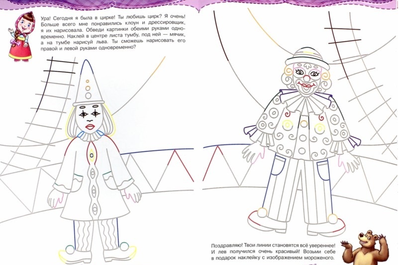Сама работа с прописями построена так, чтобы дополнительно мотивировать малыша (общение с Машей, призовые наклеечки-медальки от Медведя за хорошо сделанную работу) и помогает ему развивать моторику, ориентироваться на листе бумаги, решать логические задачи.